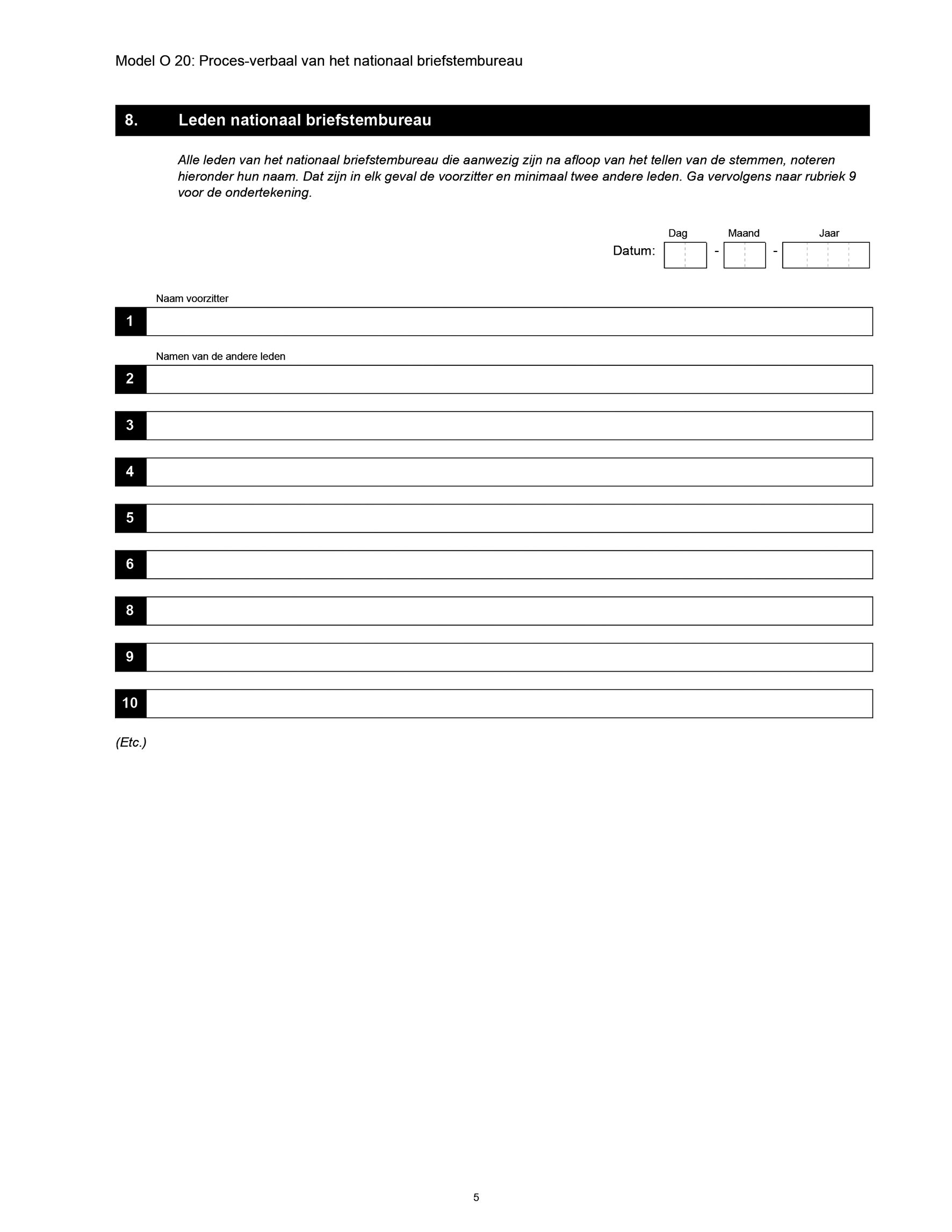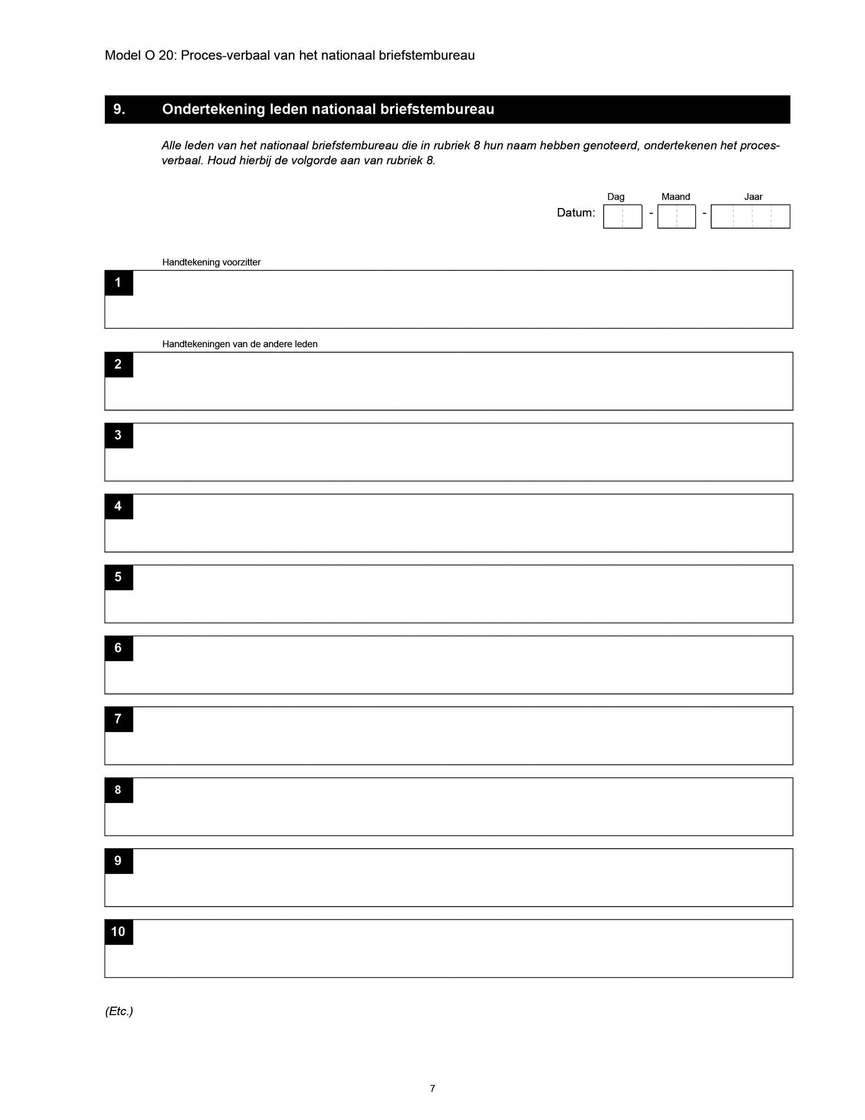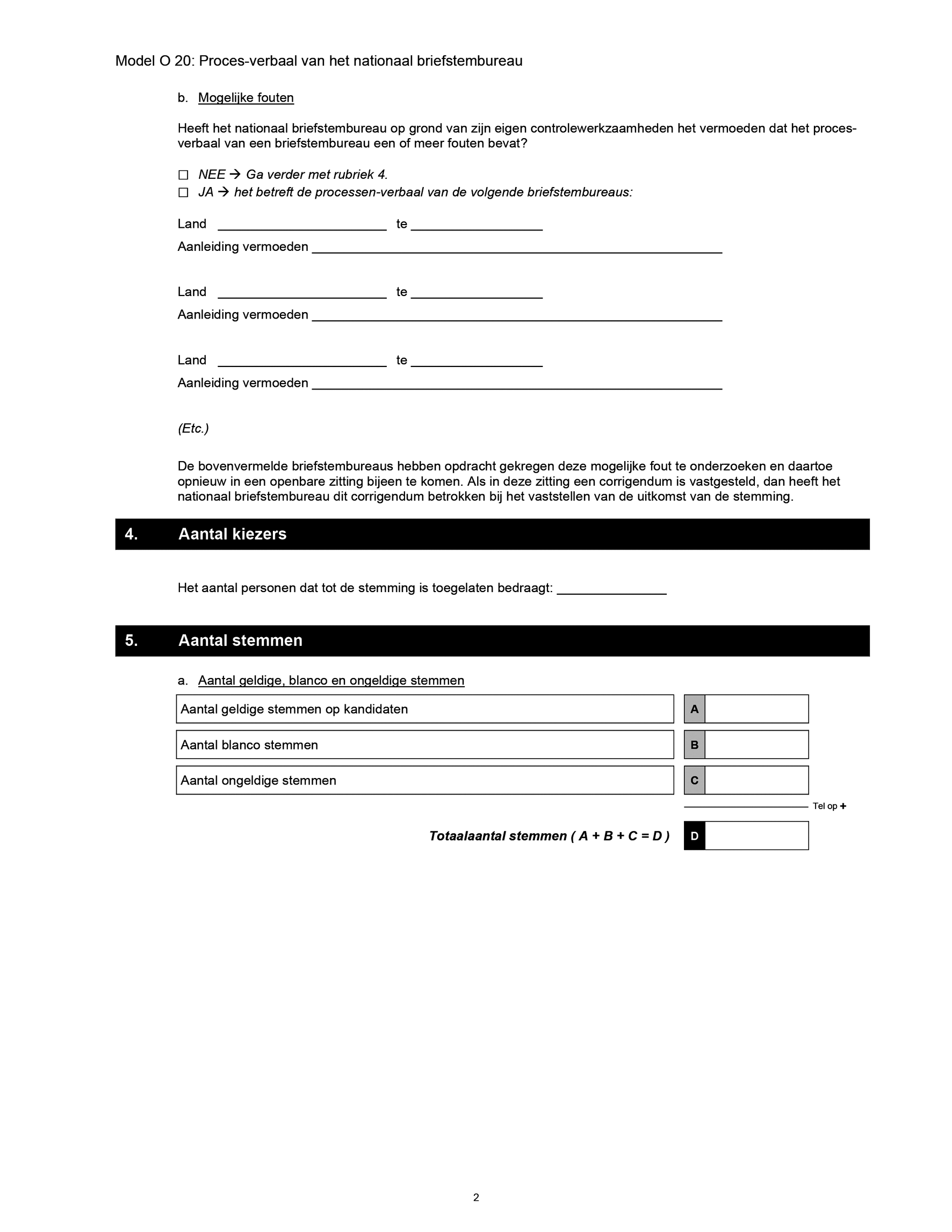 Bij het model voor het nationaal briefstembureau is bij rubriek 7 het vak voor de uitkomst van de controle toegevoegd. Er moet hier worden aangekruist of er wel of geen verschillen zijn geconstateerd na het uitvoeren van de controle. Indien er verschillen zijn geconstateerd moet er contact worden opgenomen met de Kiesraad. De uitkomst van het contact met de Kiesraad moet worden genoteerd op het proces-verbaal.