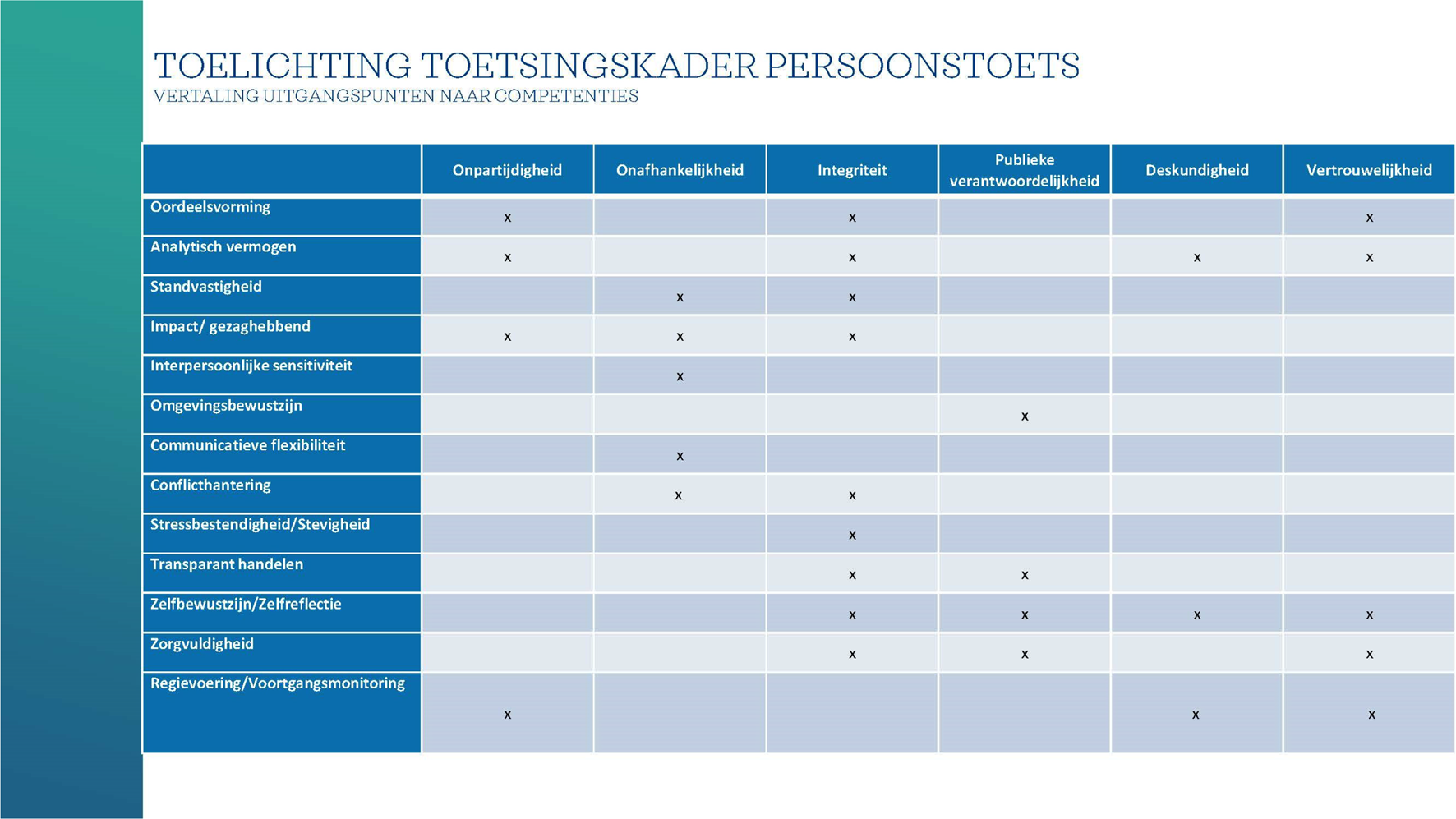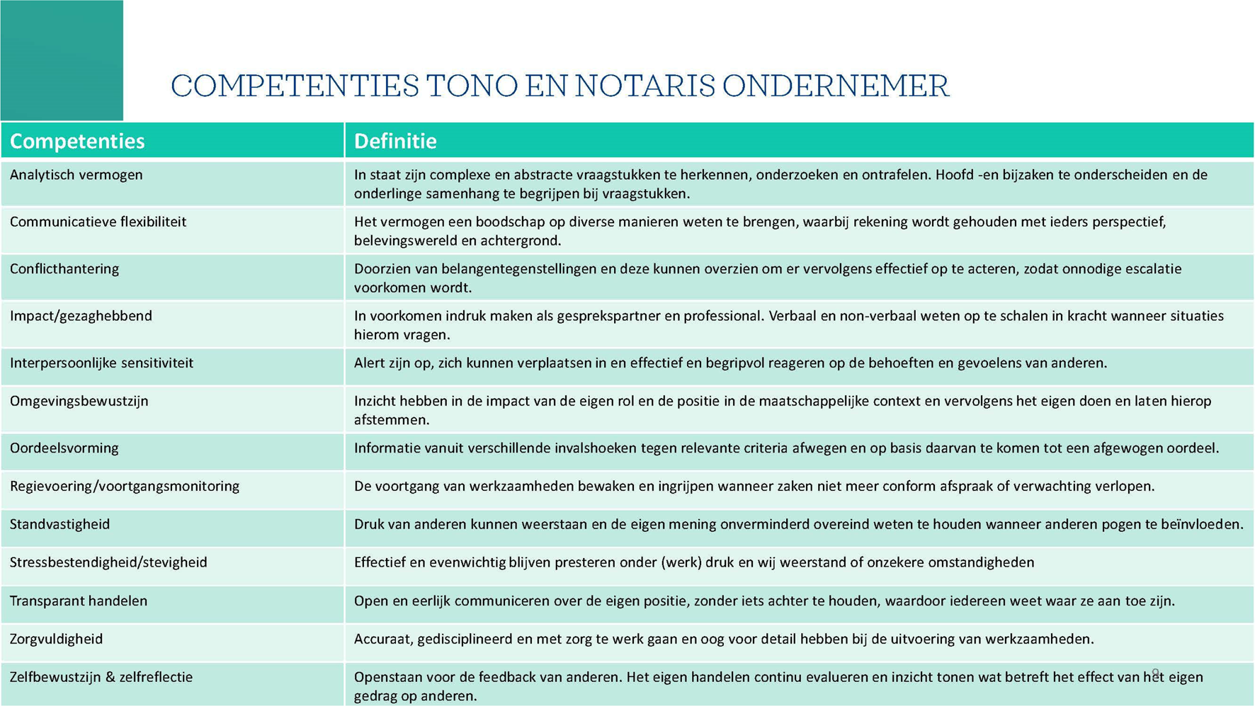 Bij het nemen van zijn beslissing toetst de minister op een aantal competenties om te bepalen of de verzoeker beschikt over de persoonlijke geschiktheid als bedoeld in artikel 8, tweede lid, Wna. Het betreffen competenties die inzicht geven in de mate waarin de verzoeker beschikt over essentiële (gedrags-)vaardigheden die onder meer zien op de kernwaarden van het notariaat. Hierbij kan gedacht worden aan aspecten die samenhangen met integriteit en de mate waarin risico op niet-integer gedrag bestaat in de vorm van persoonseigenschappen, intelligentie en competenties. De volgende kernwaarden vormen de pijlers voor de uitoefening van het ambt: