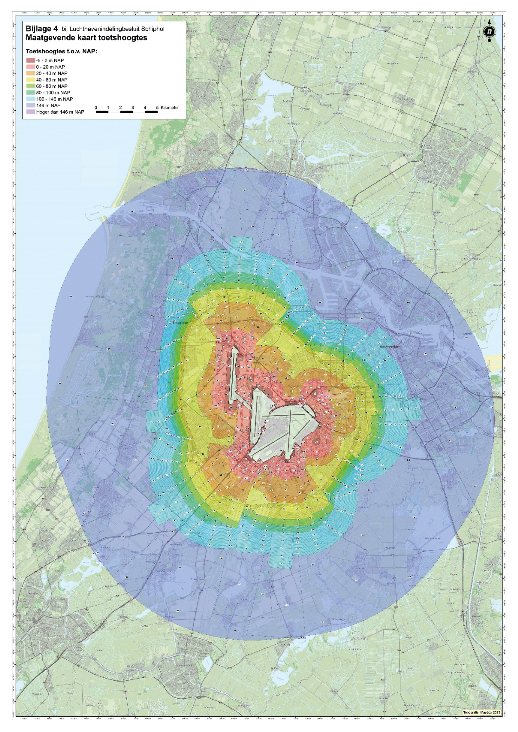 • Actualisatie van de maatgevende kaart toetshoogtes (bijlage 4) naar aanleiding van wijzigingen met betrekking tot communicatie- en navigatieapparatuur van Schiphol en de inkorting van baan 06-24 aan de noordoostzijde;