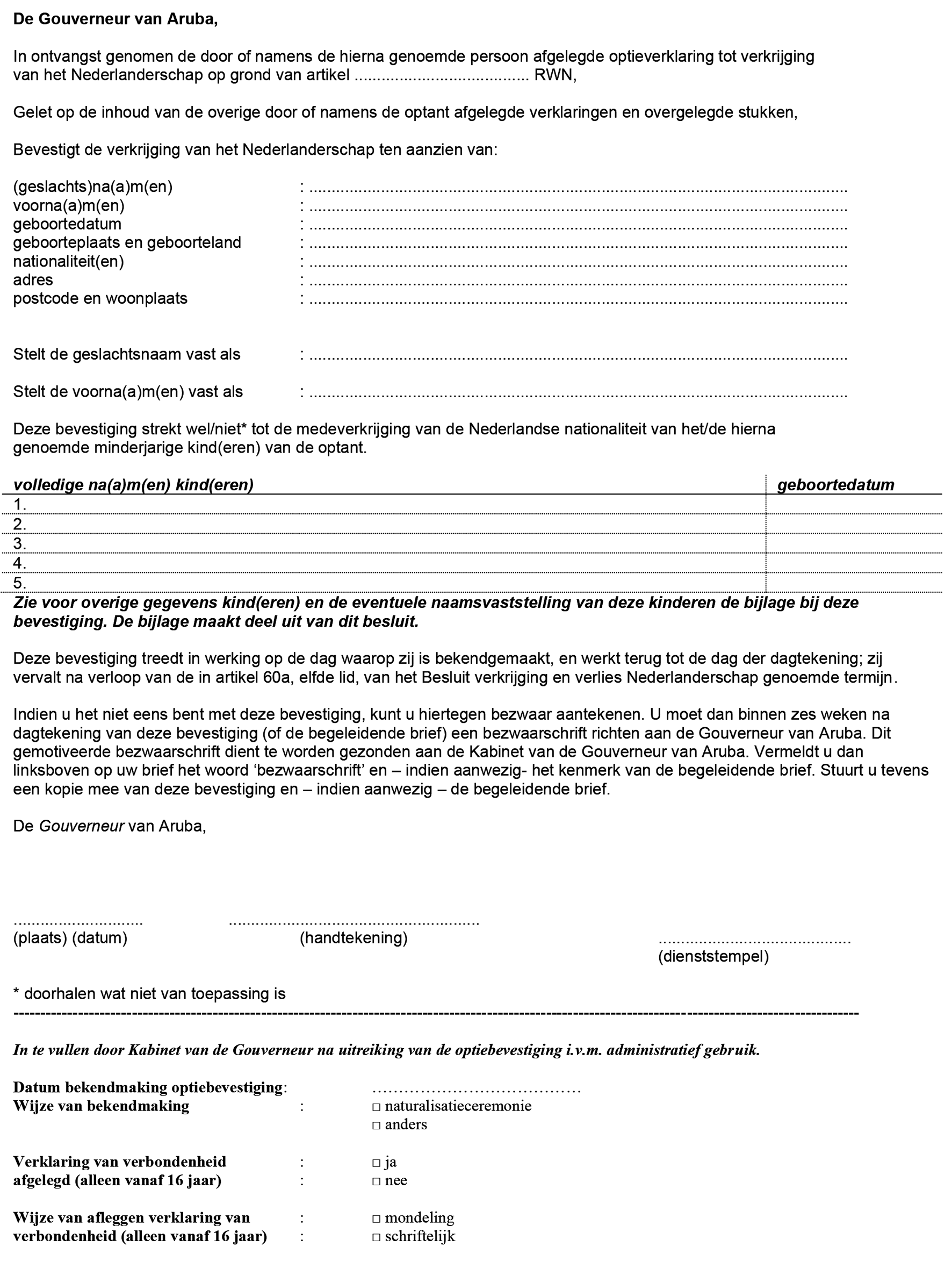 In model 1.33 HRWN-A is toegevoegd dat het Kabinet van de Gouverneur alle informatie omtrent de uitreiking van de optiebevestiging op de ceremonie in het deel ‘in te vullen door het Kabinet van de Gouverneur na uitreiking van de optiebevestiging i.v.m. administratief gebruik’ moet vermelden. Dit om er voor te zorgen dat alle modellen 1.33 (voor gebruik in Nederland, Aruba, Bonaire, Sint Eustatius en Saba, Curaçao en Sint Maarten) gelijkluidend zijn.