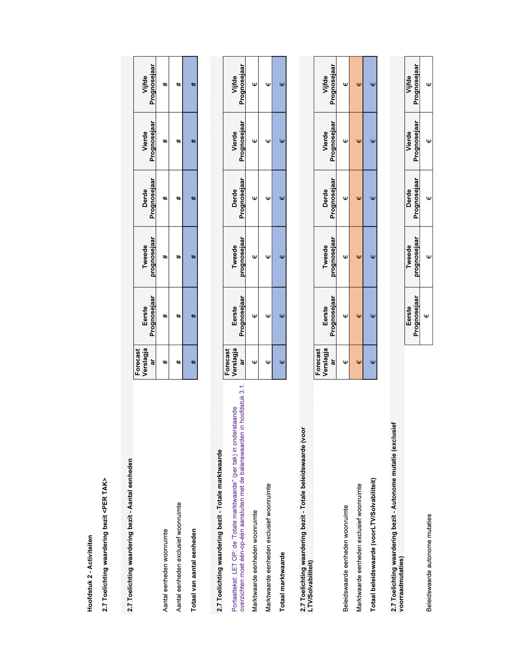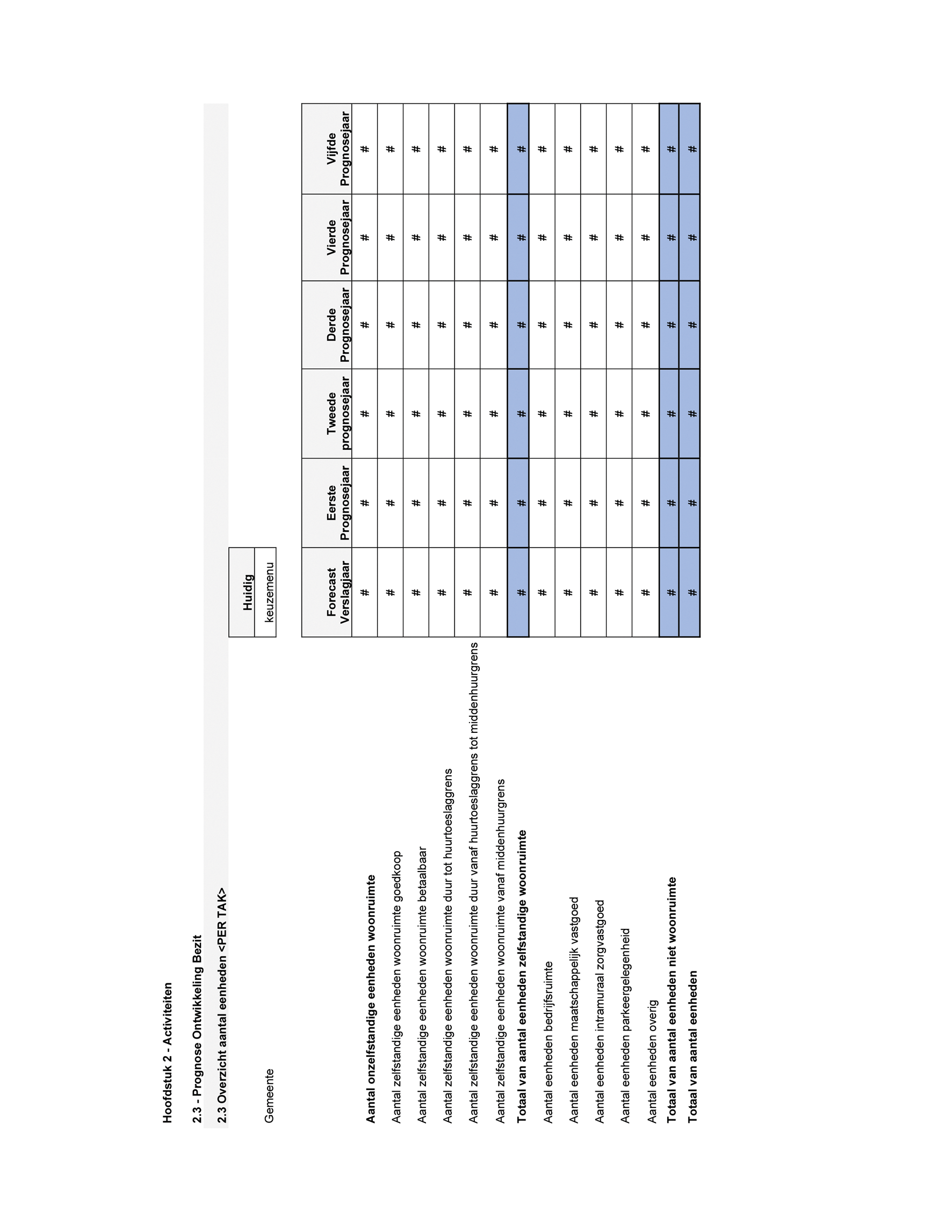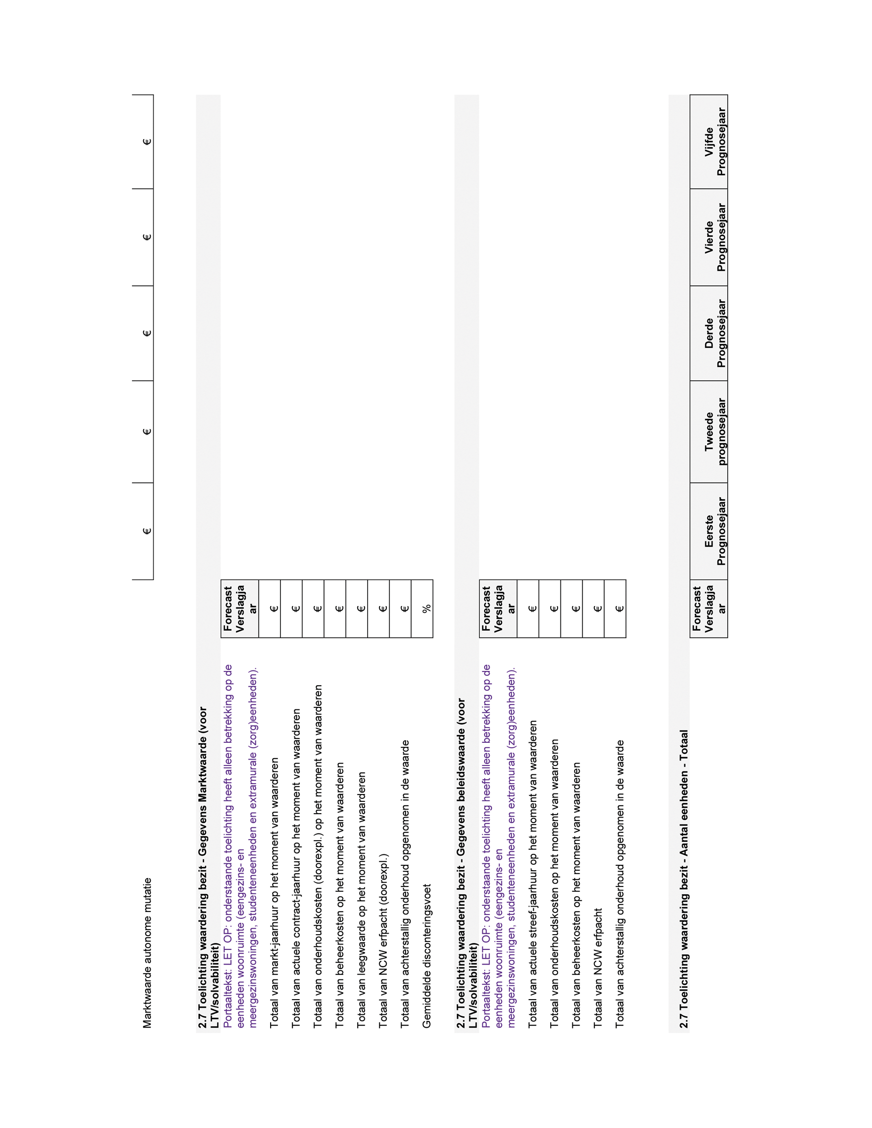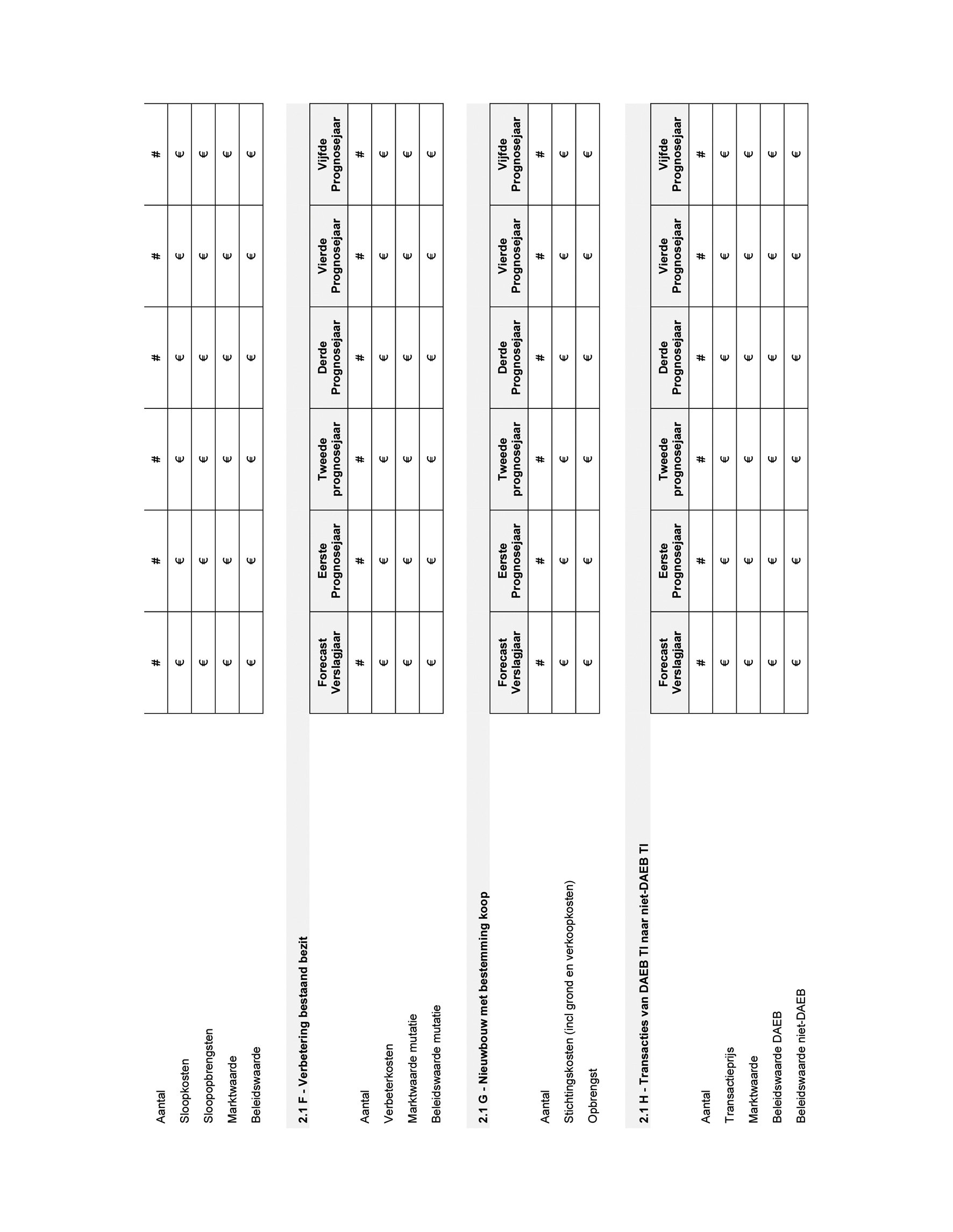 In paragraaf 2.1 H en I wordt, om het verloop van de beleidswaarde aan te sluiten met de dVi gegevensuitvraag, in beide onderdelen de regel ‘Beleidswaarde DAEB’ en de regel ‘Beleidswaarde niet-DAEB’ toegevoegd. Op deze manier kun je met de beleidswaarde ontwikkeling, als gevolg van de verantwoorde activiteiten in hoofdstuk 2.1, de waarde van t+1 bepalen.