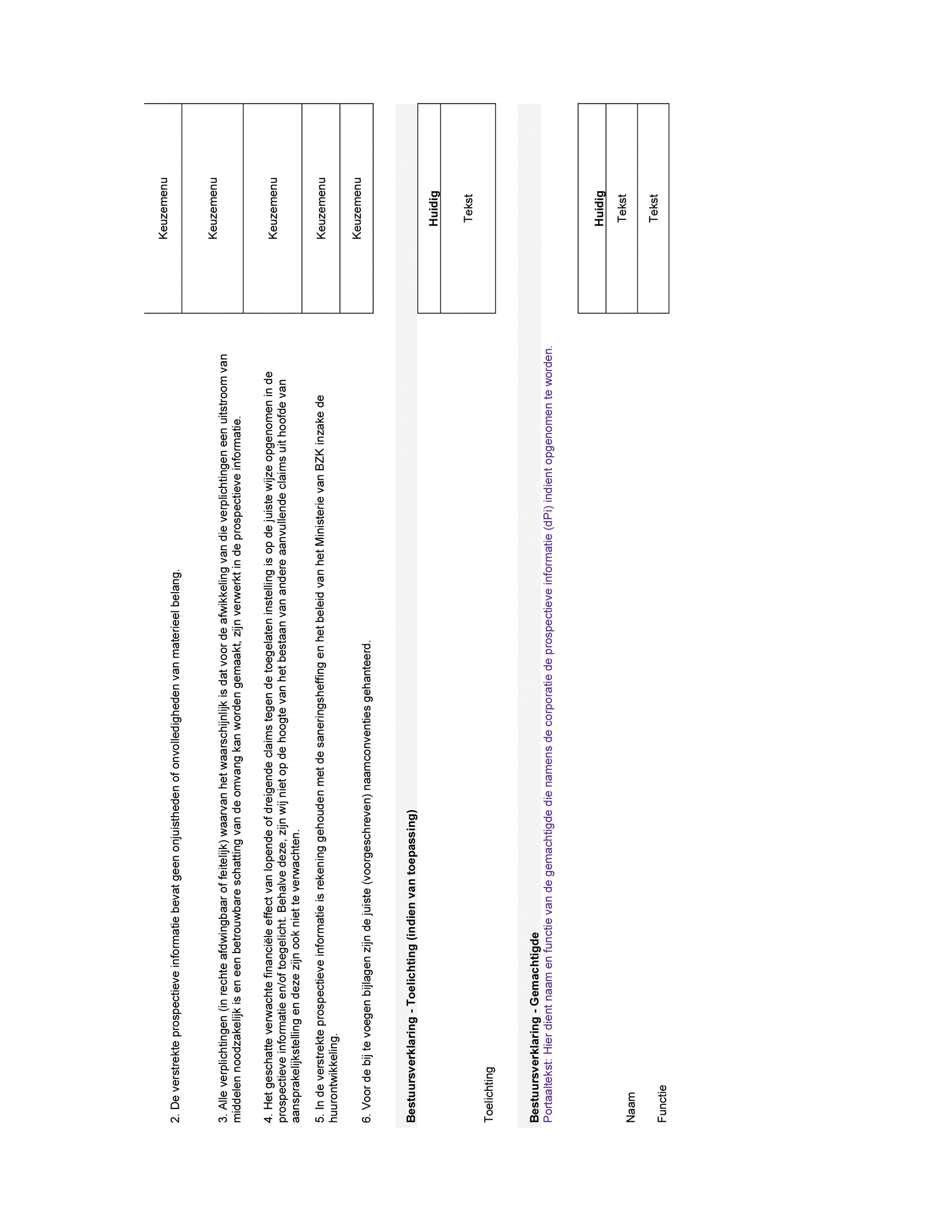 Op grond van artikel 43, eerste lid, van de Woningwet dienen woningcorporaties een overzicht op te stellen van de werkzaamheden die zij en de met hen verbonden ondernemingen in de eerstvolgende vijf kalenderjaren voornemens zijn te verrichten, ook wel de Prospectieve informatie (dPi) genoemd. Artikel 44a, eerste lid, aanhef en onderdeel a, van de Woningwet, bepaalt dat het overzicht jaarlijks voor 15 december moet worden verstrekt aan de minister, de colleges van burgemeester en wethouders en de bewonersorganisaties, en moet worden ingericht overeenkomstig bij ministeriële regeling te geven voorschriften. Uit artikel 19 van de RTIV volgt dat voor de inrichting van het overzicht gebruik moet worden gemaakt van het model dat is opgenomen in bijlage 5 bij de RTIV.