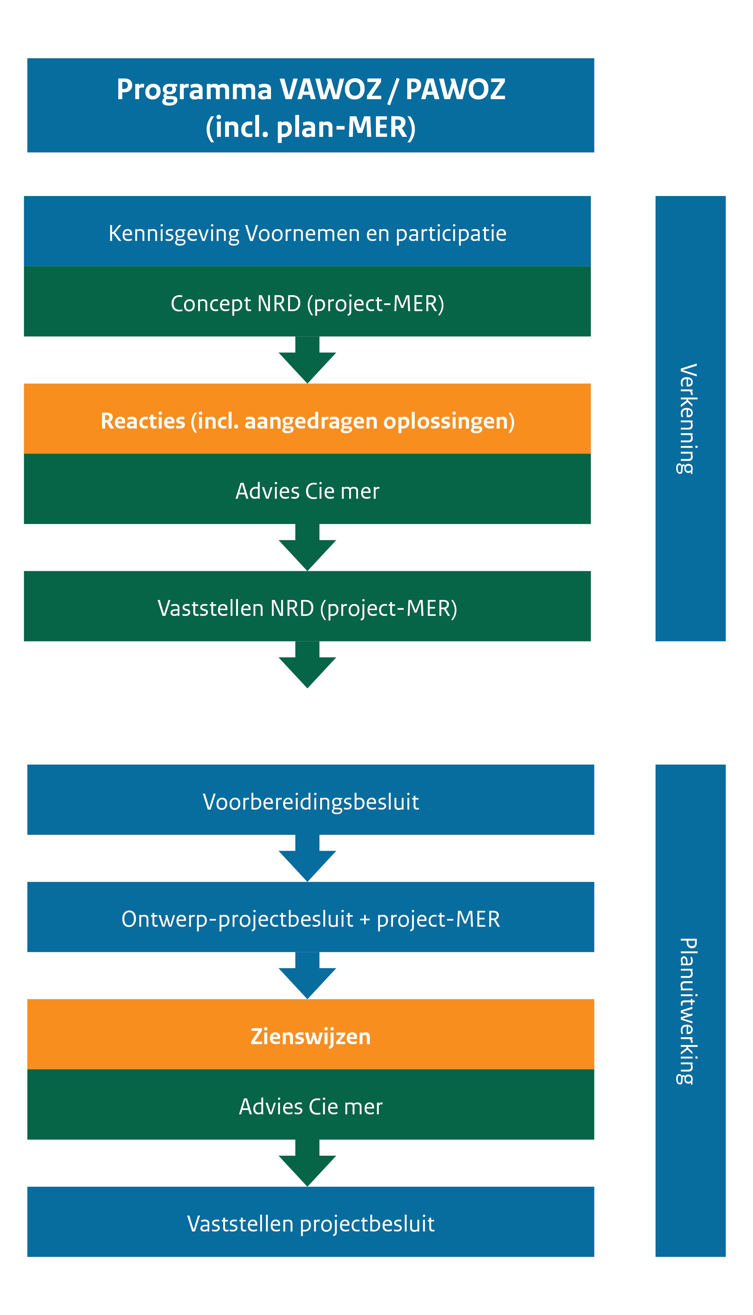 De projectprocedure heeft een aantal momenten waarop de omgeving een reactie of zienswijze bij het ministerie van Klimaat en Groene Groei kan indienen op de stukken die ter inzage liggen. In een zienswijze of reactie kan een omgevingspartij met argumenten aangeven waar zij het niet mee eens is, of welke informatie ontbreekt. Op basis van deze reactie of zienswijze kan door het ministerie van Klimaat en Groene Groei besloten worden om aanpassingen in het project te doen. Waar nodig of gewenst vinden daarover aanvullende gesprekken plaats met belanghebbenden. In afbeelding 21 wat is opgenomen in paragraaf 6.1.3 is zichtbaar op welke momenten inspraak mogelijk is.