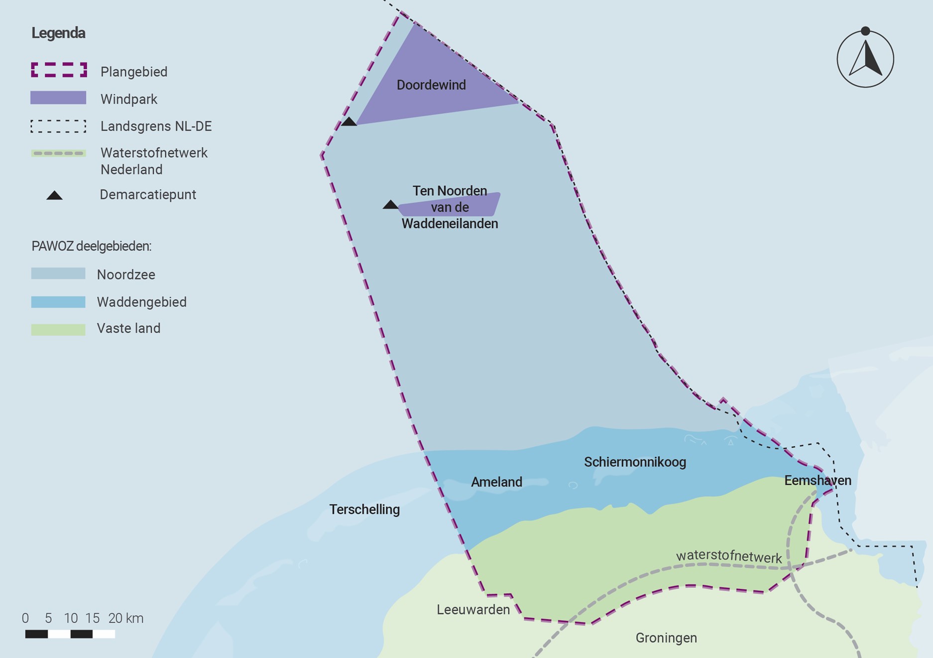 Voor de waterstofroutes geldt dat er drie mogelijke nieuwbouwroutes zijn om de aanlanding in Noord-Nederland te laten plaatsvinden: de Tunnel route (X), de Ameland Wantij route (VIII) en de Zoutkamperlaagroute (IX). Naast PAWOZ-Eemshaven lopen onderzoeken naar de mogelijkheden om bestaande gasleidingen op zee te hergebruiken voor de aanlanding van waterstof. De uitkomsten van het gebruik van bestaande gasleidingen zijn nog niet bekend. Er is een vervolgfase nodig voor een afweging van de Tunnel route (X), Ameland Wantij route (VIII), de Zoutkamperlaagroute (IX) en de mogelijkheden voor hergebruik van bestaande gasleidingen. De eerste stap in een projectprocedure die later zal plaatsvinden is de alternatievenafweging om te bepalen welke route de beste aanlandmogelijkheid voor Noord-Nederland is. In de projectprocedure zal ook de keuze worden gemaakt voor Noordzeeroute C of D en de routes op land.