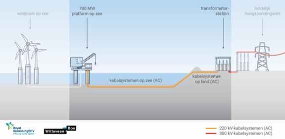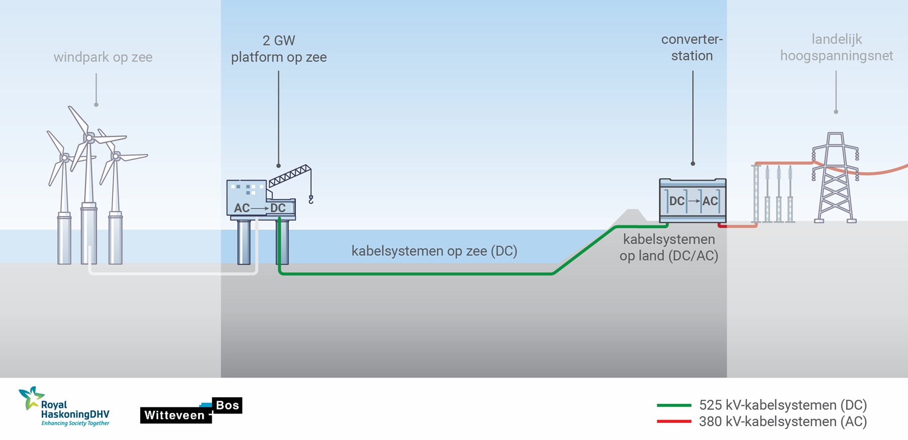 Het windenergiegebied DDW heeft een capaciteit van 4GW. Het gebied bestaat uit twee delen die beide een platform nodig hebben met ieder een eigen kabelverbinding. De gebieden moeten dus met twee gelijkstroom (DC)-kabelverbindingen (van elk 2 GW) worden aangesloten op het landelijk hoogspanningsnet. Terug naar link van noot.