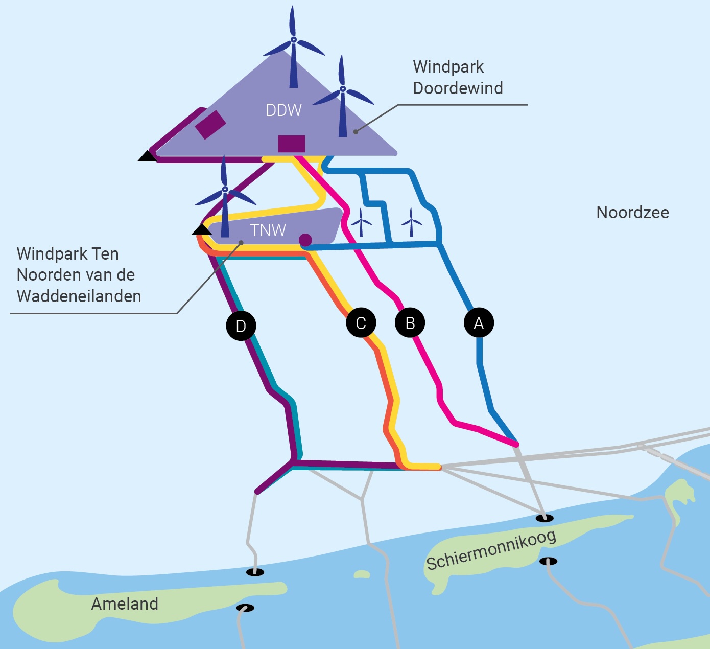 Voor kabelverbindingen geldt dat er voor Doordewind één Waddengebiedroute zorgt dat de wind op zee op tijd aanlandt: de Schiermonnikoog Wantijroute (VII) met bijbehorende landroute. De route is op een betrouwbare manier te realiseren, met bestaande aanlegtechnieken die elders ook succesvol zijn toegepast. Om te zorgen dat de energietransitie blijft doorgaan en de nationale en regionale doelen in beeld blijven wordt de Schiermonnikoog Wantrij route gekozen voor Doordewind.