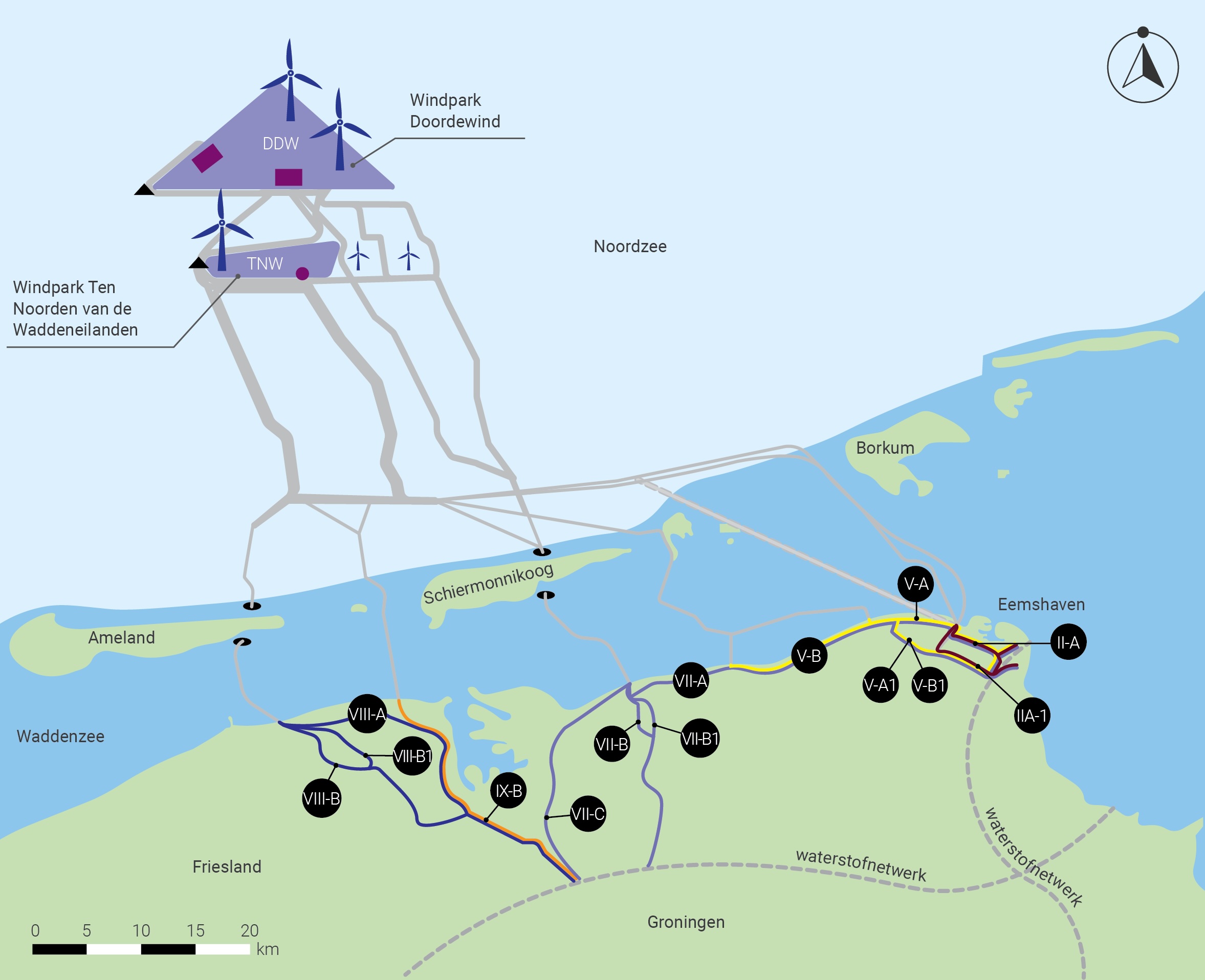 Waddenzee + Land | II - Oude Westereems (2036)VII - Schiermonnikoog Wantij (2033)X -Tunnel (2036) | VIII - Ameland Wantij (2032)IX – Zoutkamperlaag (2032)X - Tunnel (2036) |