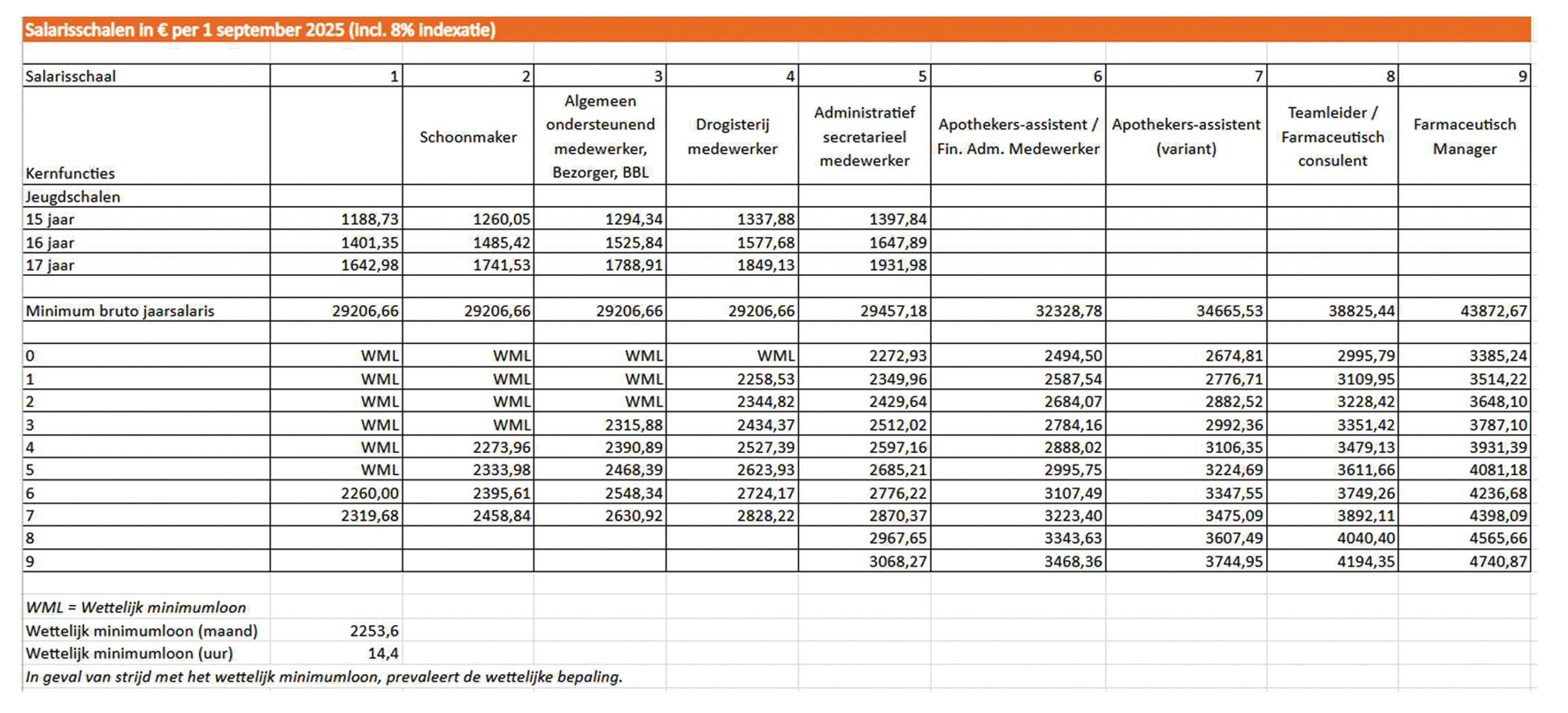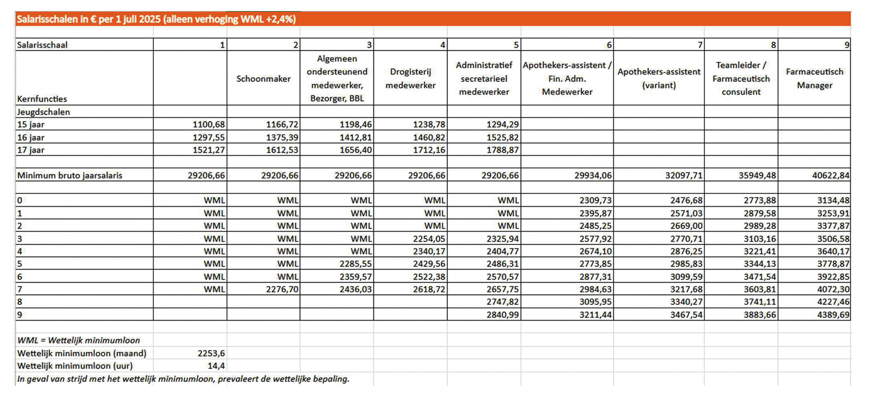 4. Voor werknemers van 15, 16 of 17 jaar zijn de jeugdschalen van toepassing, tenzij de werknemer student BBL is of een diploma van apothekersassistent bezit. In dat geval dient volgens de functionele schaal ingeschaald te worden.