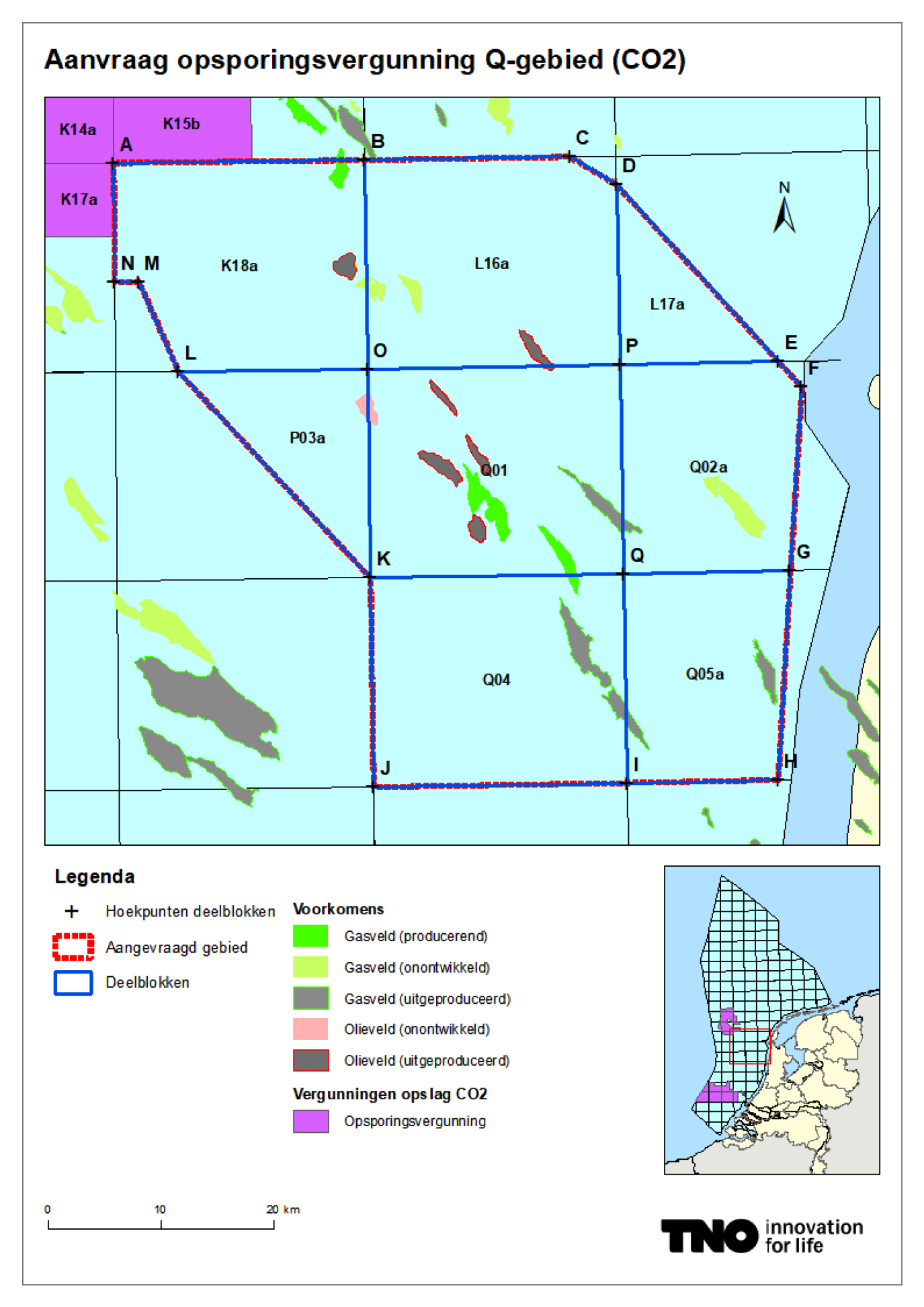 Onder verwijzing naar artikel 26b van de Mijnbouwwet nodigt de Minister van Klimaat en Groene Groei hierbij eenieder uit tot het indienen van een concurrerende aanvraag voor een opsporingsvergunning van CO2-opslagcomplexen voor de blokken Q01 en Q04 en de blokdelen K18a, L16a, L17a, P03a, Q02a, Q05a.