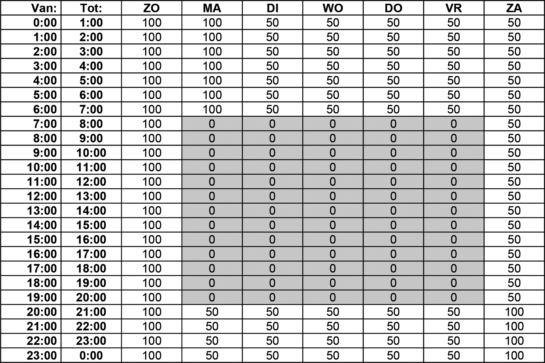 NB. Een feestdag wordt gelijk gesteld met een zondag en vangt voor de toepassing van deze matrix aan om 20:00 uur op de voorafgaande dag en eindigt om 7:00 uur op de volgende dag.