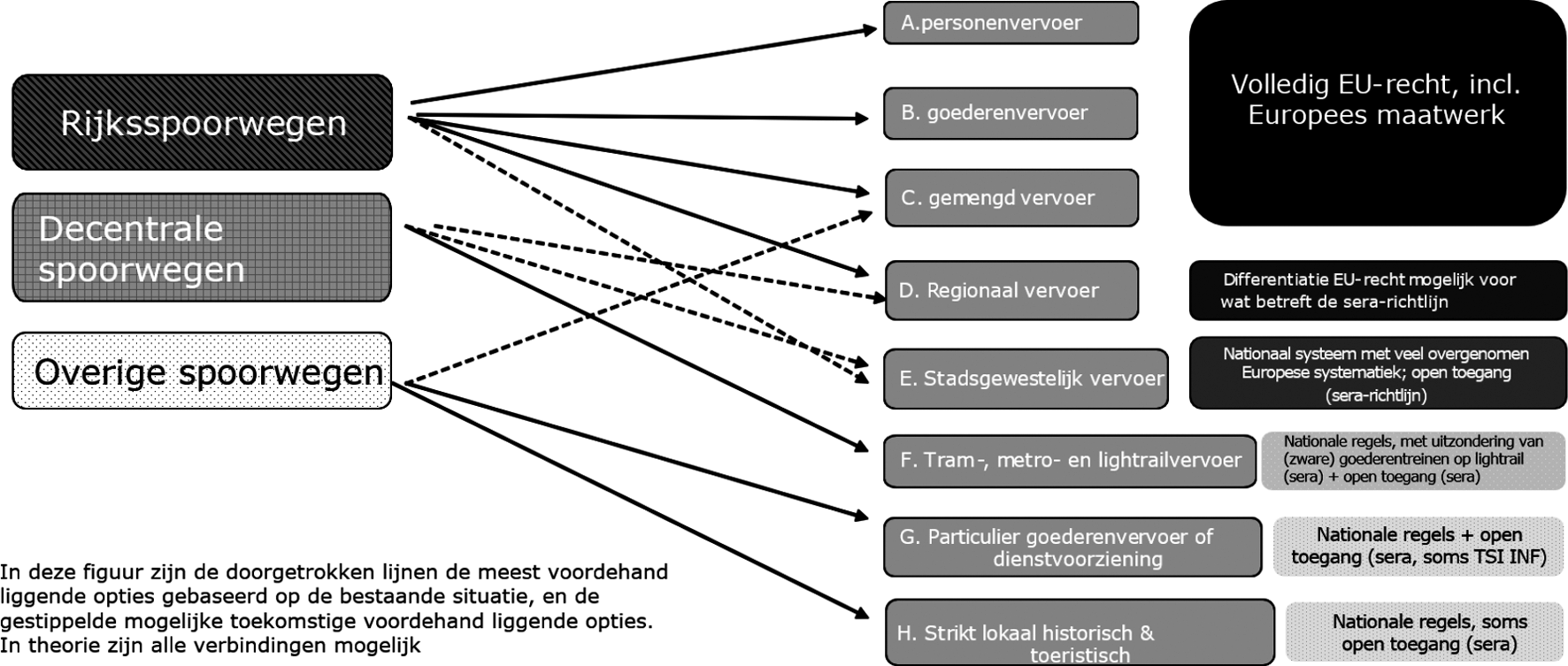 Hoewel het voorstel maar beperkt nieuwe eisen stelt, is sprake van enkele belangrijke wijzigingen. Zo wordt de koppeling tussen de bestuurlijke verantwoordelijkheid voor het spoor en het toepasselijke juridische kader losgelaten. In plaats daarvan zullen de (nieuwe) gebruiksfuncties van spoorwegen het toepasselijke juridische kader bepalen. Zo geldt voor de gebruiksfuncties A (spoor met hoofdzakelijk personenvervoer), B (spoor met hoofdzakelijk goederenvervoer) en C (zowel personen- als goederenvervoer) dat het Unierecht volledig van toepassing is,7 terwijl voor gebruiksfuncties E en F (lokale netten) geldt dat het Unierecht grotendeels niet van toepassing is, zodat meer ruimte is voor het stellen van nationale regels. In het wetsvoorstel wordt per paragraaf bepaald voor welke gebruiksfuncties de daar gestelde regels van toepassing zijn.