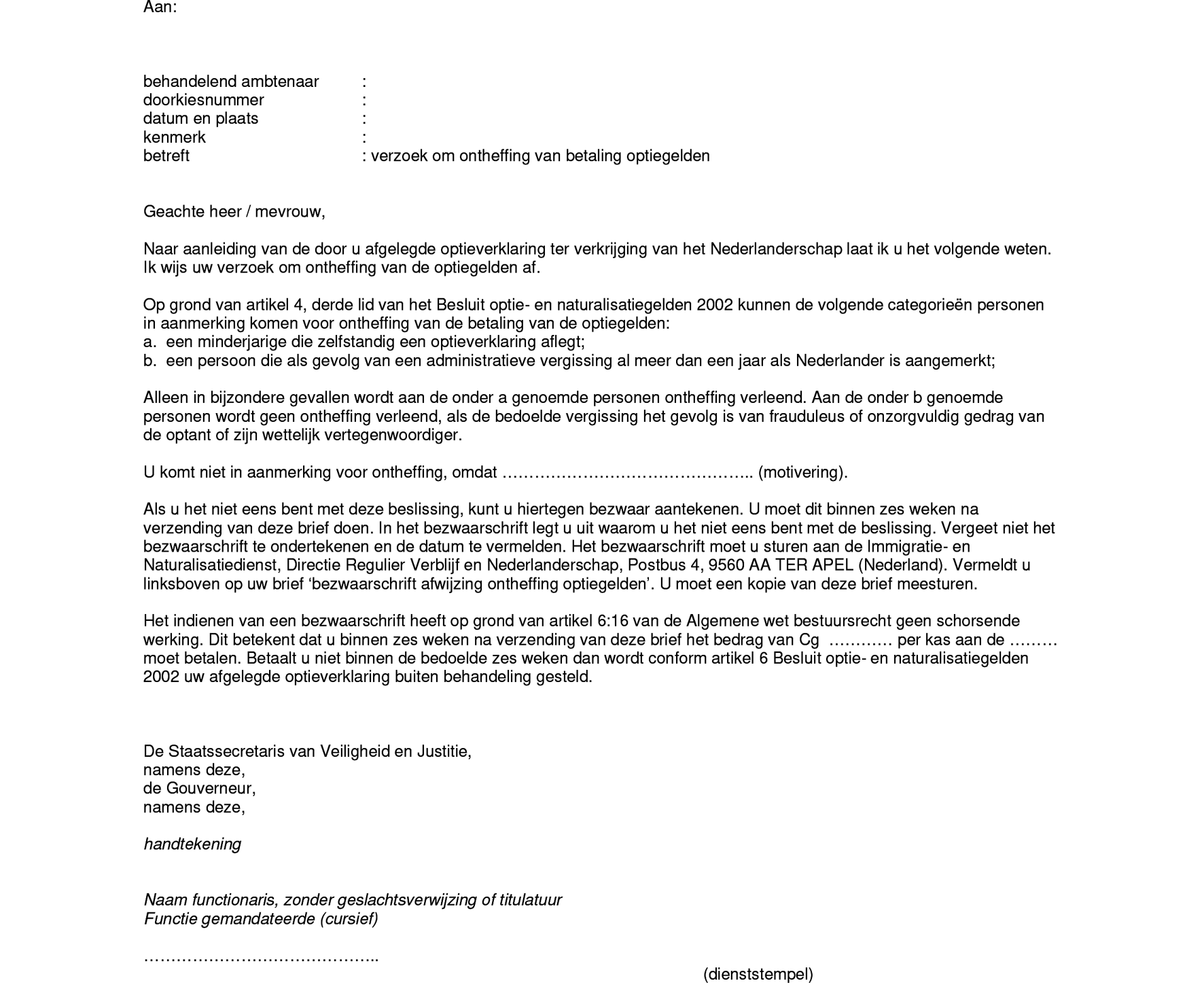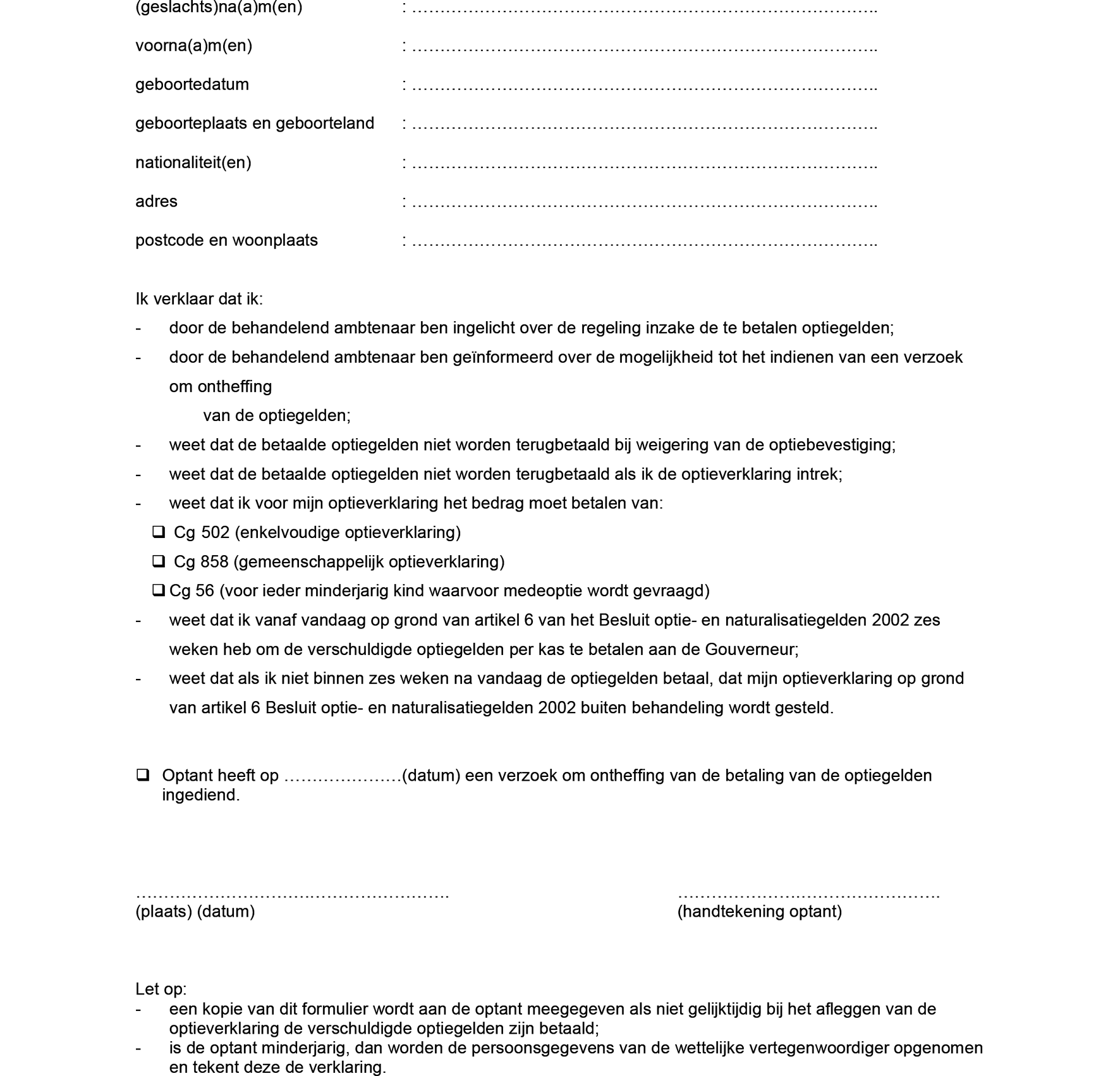 Model 1.25 HRWN-CM: Verklaring ‘Ingelicht over betaling van optiegelden’ tevens inverzuimstelling; alsook: Verklaring vrijgesteld van optiegelden
