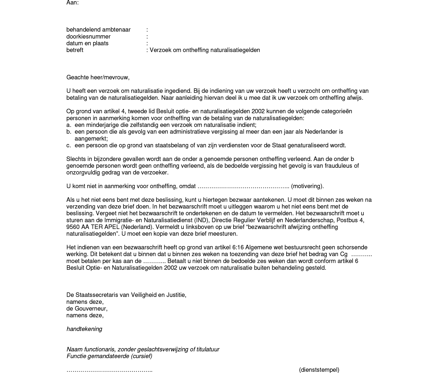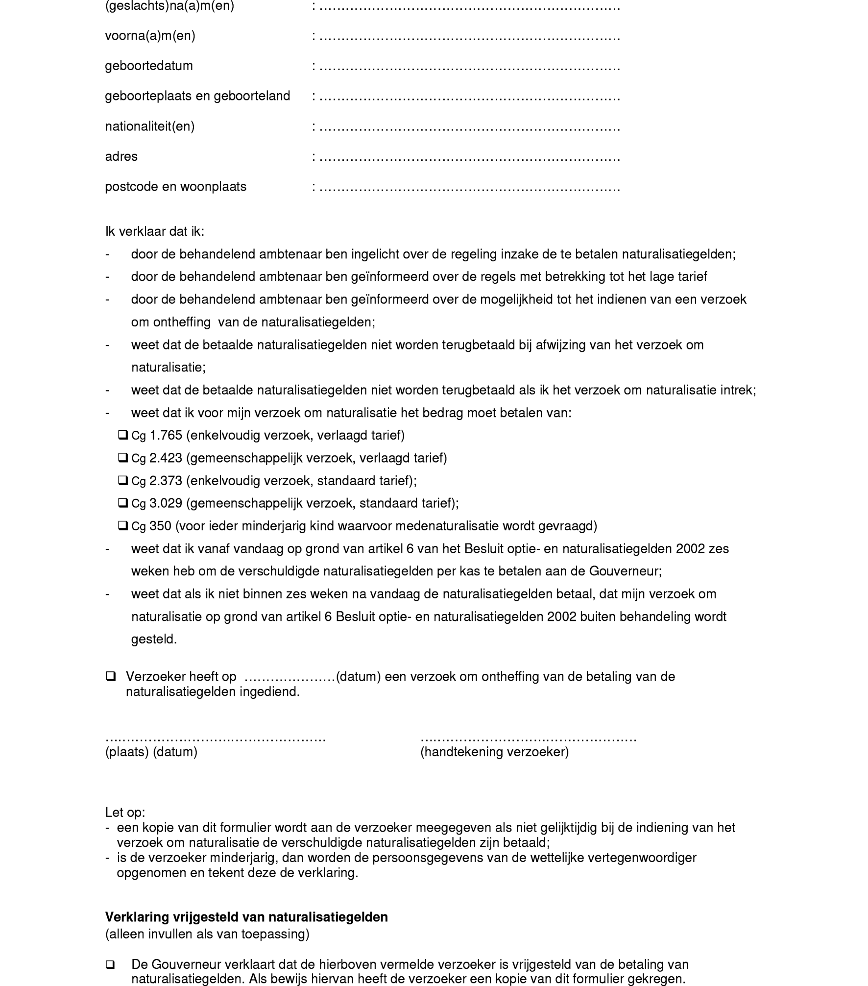 Model 2.8 HRWN-CM: Verklaring ‘Ingelicht over betaling van naturalisatiegelden’ tevens inverzuimstelling; alsook: Verklaring vrijgesteld van naturalisatiegelden