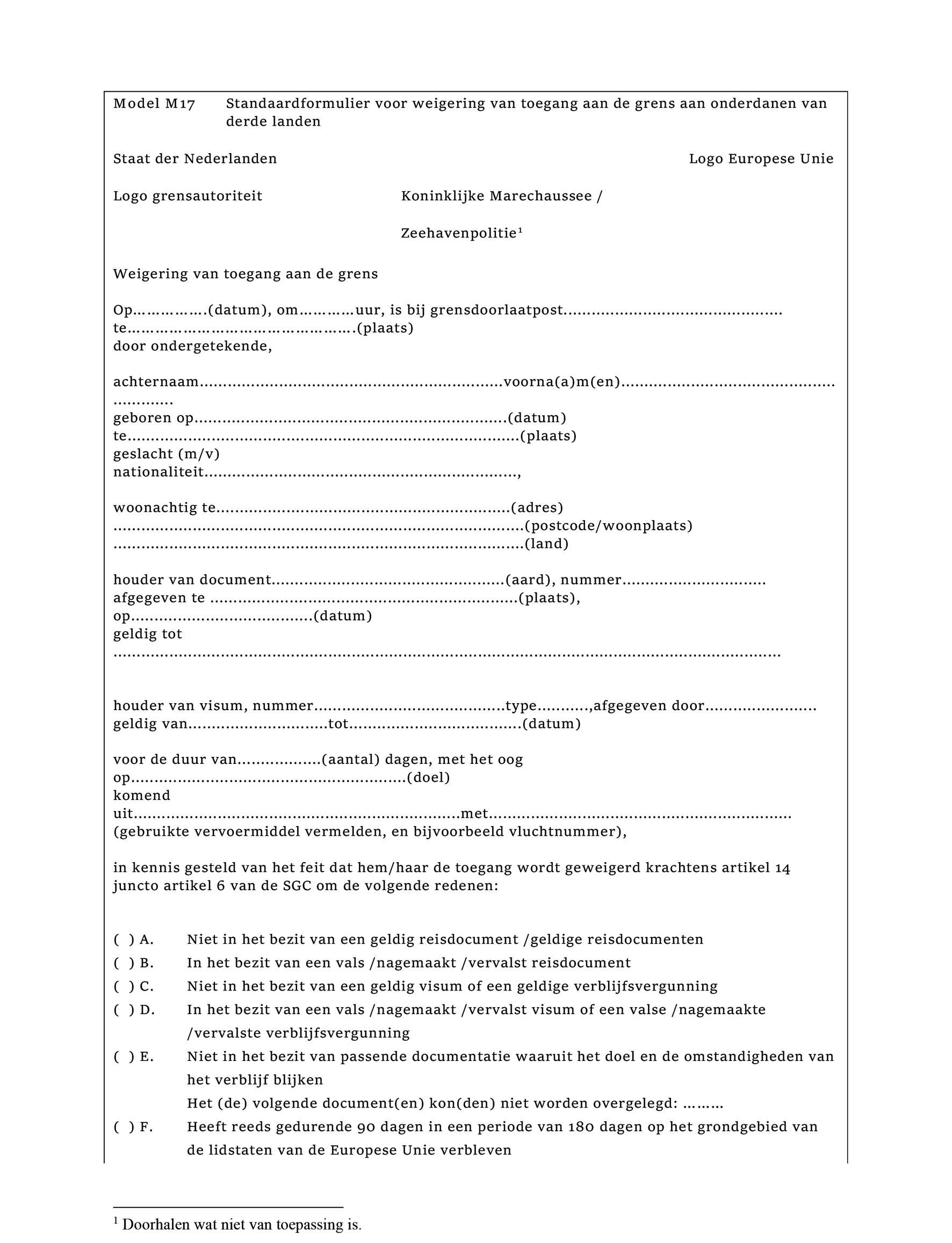 Model M17 Standaardformulier voor weigering van toegang aan de grens aan onderdanen van derde landen