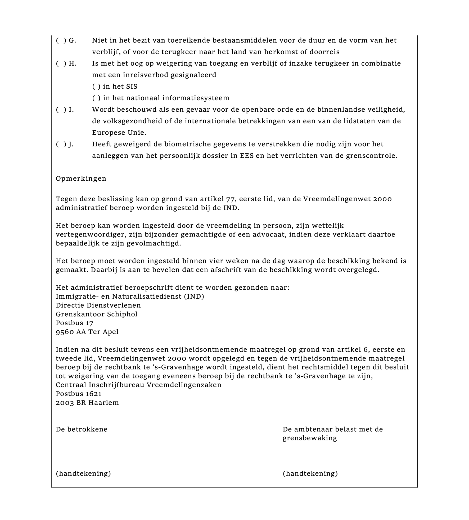 De ambtenaar belast met de grensbewaking weigert de toegang aan iedere vreemdeling die niet aan de toegangsvoorwaarden voldoet. De ambtenaar voegt een notitie van de toegangsweigering toe aan het persoonlijke dossier van de vreemdeling in EES en stelt een formulier M17 op, tenzij de vreemdeling een aanvraag voor een verblijfsvergunning asiel voor bepaalde tijd indient. De weigering van toegang is een met redenen omklede beslissing: