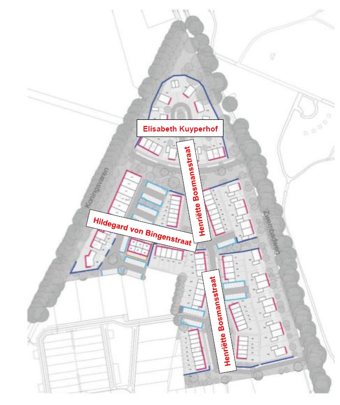De straatnamen Hildegard Von Bingenstraat, Elisabeth Kuyperhof en Henriëtte Bosmansstraat aan de planontwikkeling nabij Zwembadweg te Sint-Oedenrode;