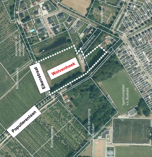 De straatnaam Wolvenhoek aan de planontwikkeling nabij Eikenstraat / Populierenlaan te Boskant;