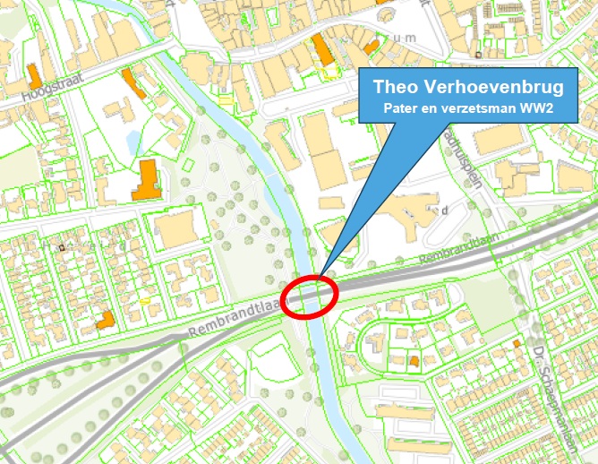 Toekennen van de naam Theo Verhoevenbrug aan de Aa-brug ter hoogte van de Rembrandtlaan te Veghel met onderschrift Pater en verzetsman WW2;
