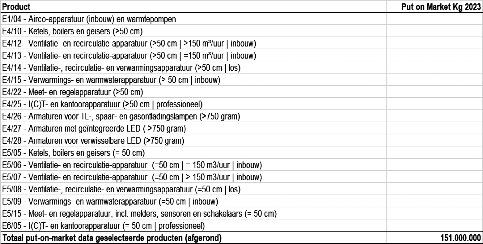 Afgerond 151.000 ton aan nieuwe apparaten binnen een bedrijfsmatige context is op de Nederlandse markt gezet in 2023. Dit zal op termijn terugkomen als AEEA, waarbij er ook sprake is van een vervanging van product A door B. Als voorbeeld de warmtepompen (E1/04). Deze zullen CV-ketels gaan vervangen waardoor meer CV- ketels als AEEA afgevoerd zullen worden. Pas op de middellange termijn zullen de warmtepompen als AEEA vrijkomen. Warmtepompen zijn zwaarder dan CV-ketels waardoor alleen al door deze wijziging het volume verder zal toenemen. De bovengenoemde apparaten zijn hoog-metaal houdend dus gevoelig om als lekstroom te worden afgevoerd, exact de lekstromen waarop de afgifteplicht zich richt.