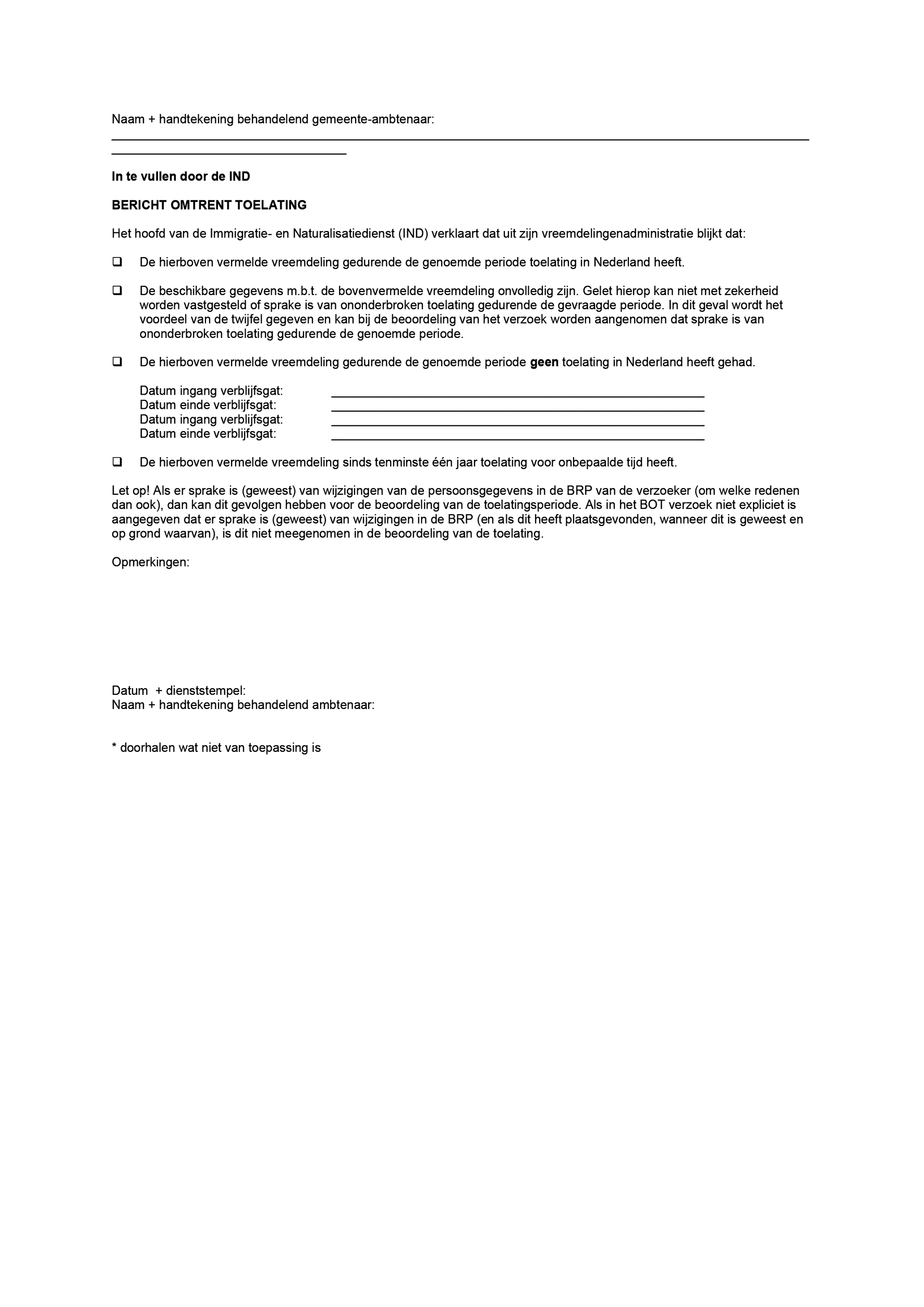 Het begrip ‘toelating voor onbepaalde tijd’ heeft dezelfde betekenis als ‘geen bedenkingen tegen verblijf voor onbepaalde tijd’ in artikel 8, eerste lid, aanhef en onder b, RWN. Een vreemdeling tegen wiens verblijf voor onbepaalde tijd in Nederland geen bedenkingen bestaan, voldoet dan ook aan het vereiste ‘toelating voor onbepaalde tijd’. Op de wijze als beschreven in de toelichting bij artikel 8, eerste lid, aanhef en onder b, paragraaf 4, HRWN en met behulp van de daar opgenomen bijlagen kan worden beoordeeld of wordt voldaan aan dit vereiste.