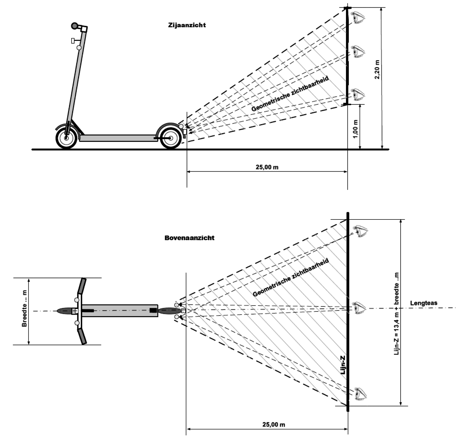 Ten eerste moet de verlichting te zien zijn voor verkeersdeelnemers die zich bevinden op een horizontale lijn loodrecht en gecentreerd ten opzichte van de lengteas van het voertuig (lijn-Z), 1) waarvan het middelpunt is gelegen op een afstand van 25 meter ten opzichte het achterste punt van het voertuig en 2) de lengte 13,4 meter is, vermeerderd met de breedte van het voertuig in meters tot één decimaal nauwkeurig. De lengte van de lijn vanaf waar de verlichting waarneembaar moet zijn, wordt dus steeds langer naar mate de bijzondere bromfiets breder is. Vanuit het oogpunt van verkeersveiligheid is het namelijk wenselijk dat een breder voertuig eerder te zien is voor verkeersdeelnemers die zich links- of rechtsachter het voertuig bevinden.