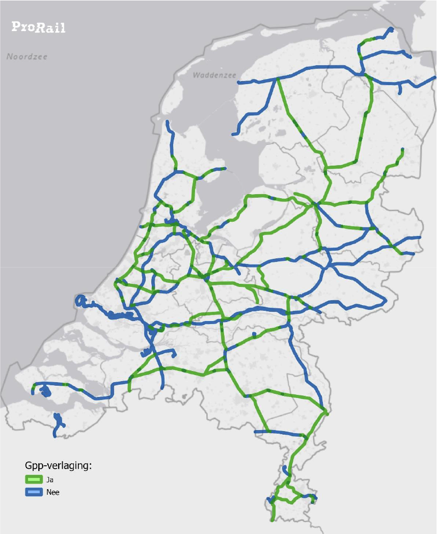 Het vervolgonderzoek is vastgelegd in het rapport ‘Landelijke gpp-verlaging 2025 - akoestisch onderzoek’ van ProRail, met datum 6 oktober 2025. Uit het onderzoek blijkt dat 26.614 geluidproductieplafonds gelegen langs spoortrajecten door heel Nederland, kunnen worden verlaagd. Op onderstaande afbeelding zijn de spoorgedeelten waar de geluidproductieplafonds worden verlaagd in groen weergegeven. De gemiddelde verlaging bedraagt 2,9 dB.