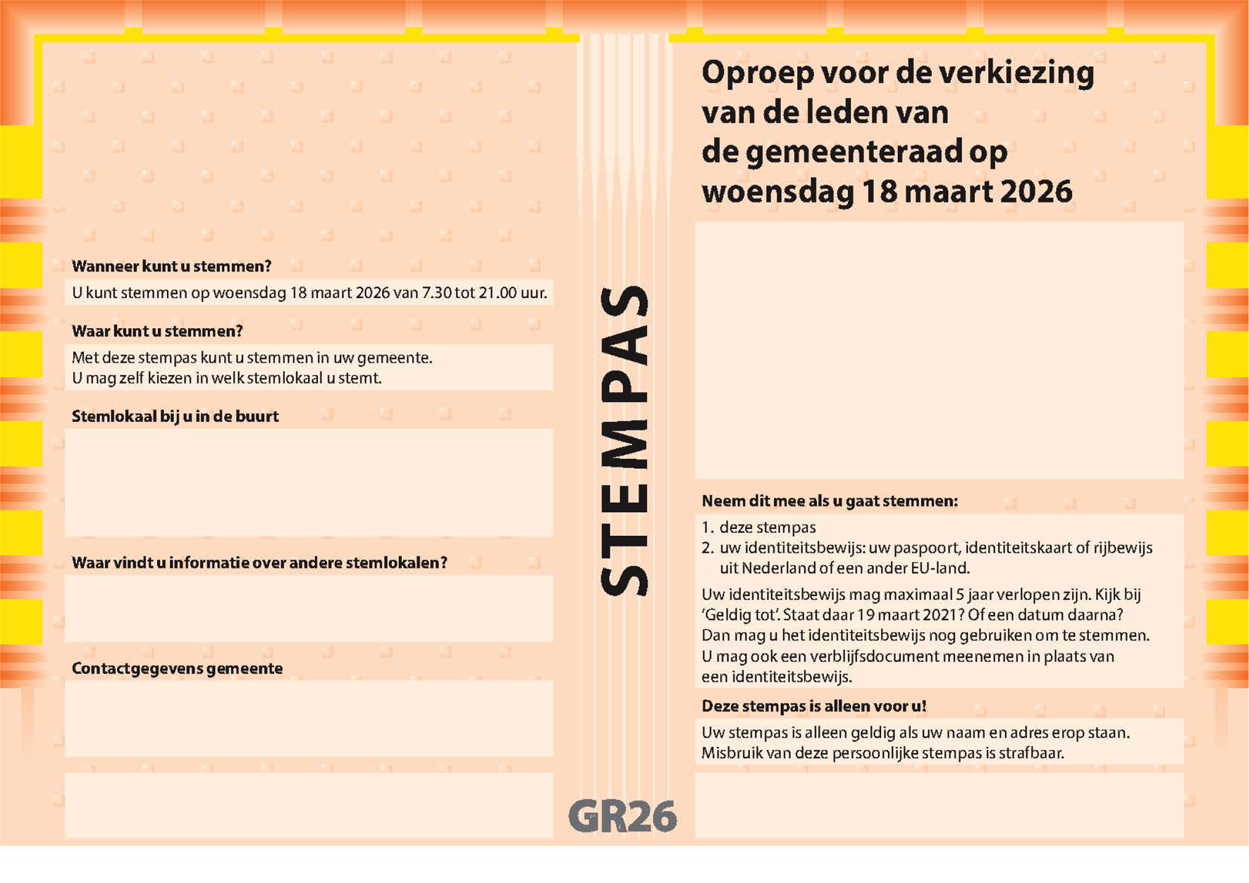 Op 18 maart 2026 vinden de gemeenteraadsverkiezingen plaats. Op grond van de artikelen J 7, derde lid, en L 11, tweede lid, van de Kieswet worden in deze regeling de modellen voor de stempas en het schriftelijk volmachtbewijs voor deze verkiezingen vastgesteld.