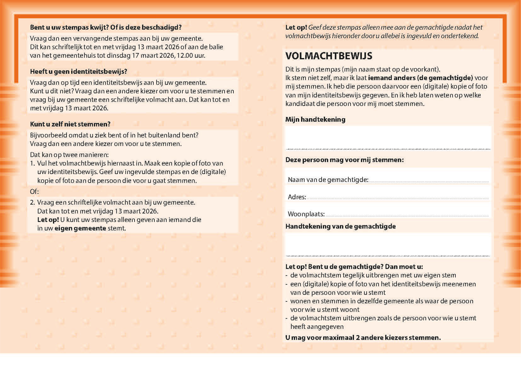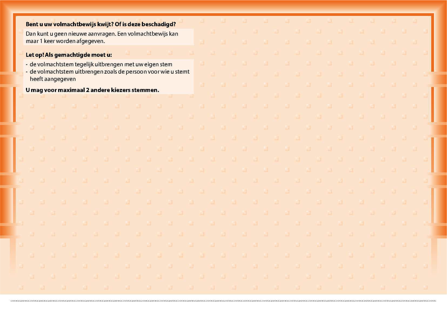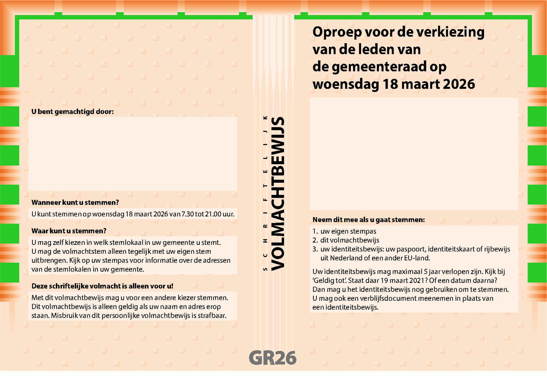 • 1. Het model voor het schriftelijk volmachtbewijs luidt voor een verkiezing van de leden van de gemeenteraad of voor een verkiezing als bedoeld in artikel 52 van de Wet algemene regels herindeling als volgt:
