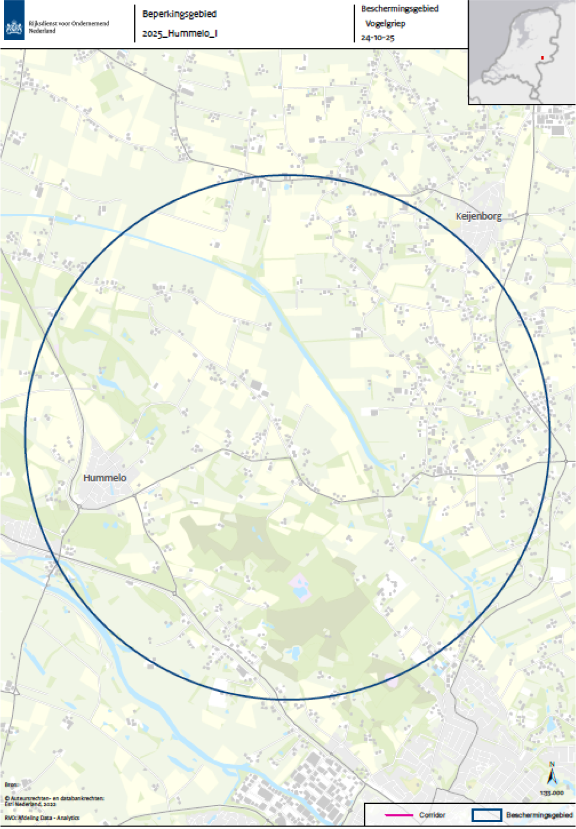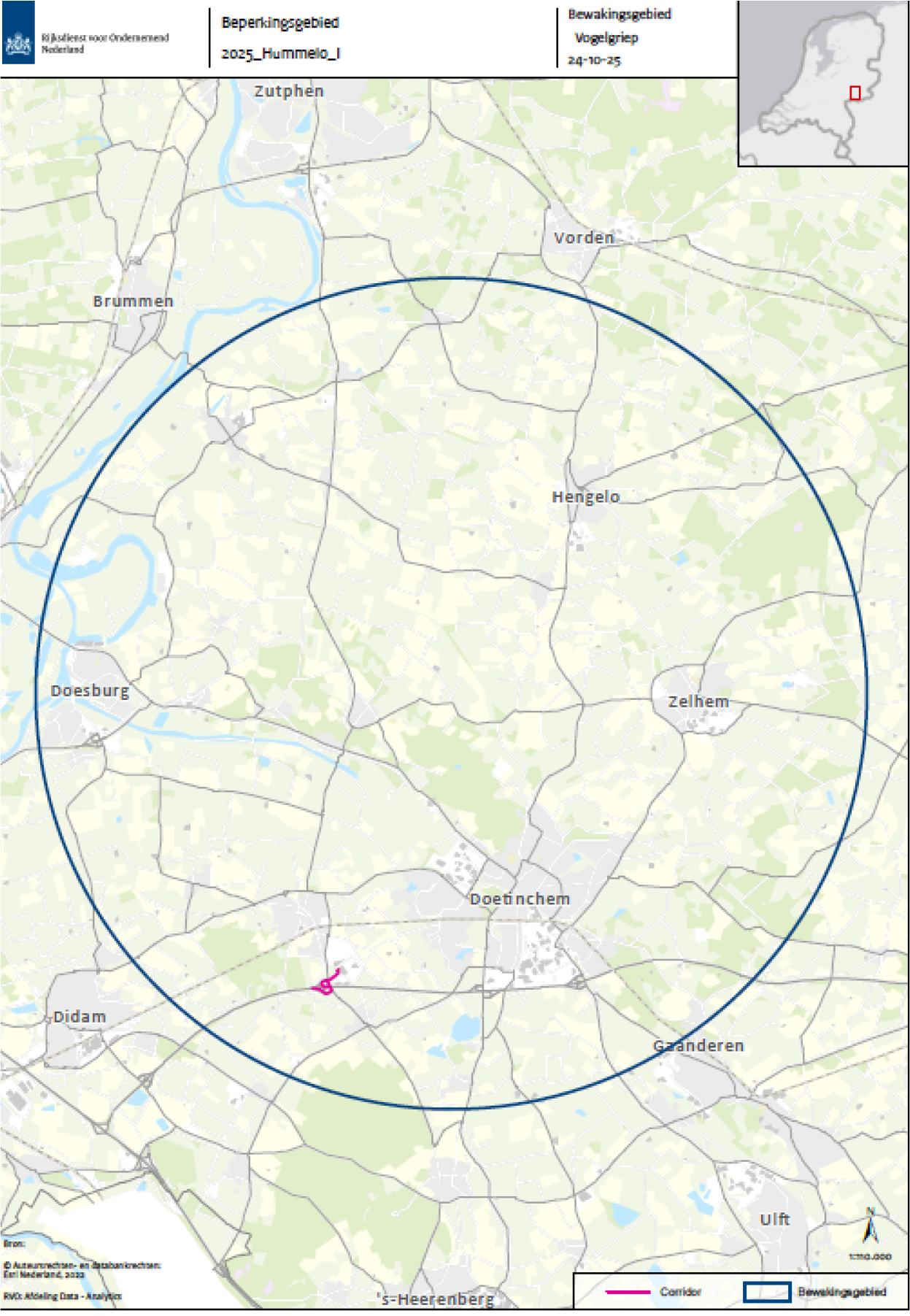 De beschermingszone en bewakingszone zijn respectievelijk het gebied met een straal van 3 en 10 kilometer rond de besmette inrichting, zoals aan de hand van een plattegrond is aangeduid in bijlagen 1 en 2. Een inzoombare, gedetailleerde kaart van die zone is beschikbaar op de website van de Rijksdienst voor Ondernemend Nederland (RVO) (Dierziekteviewer (rvo.nl)).