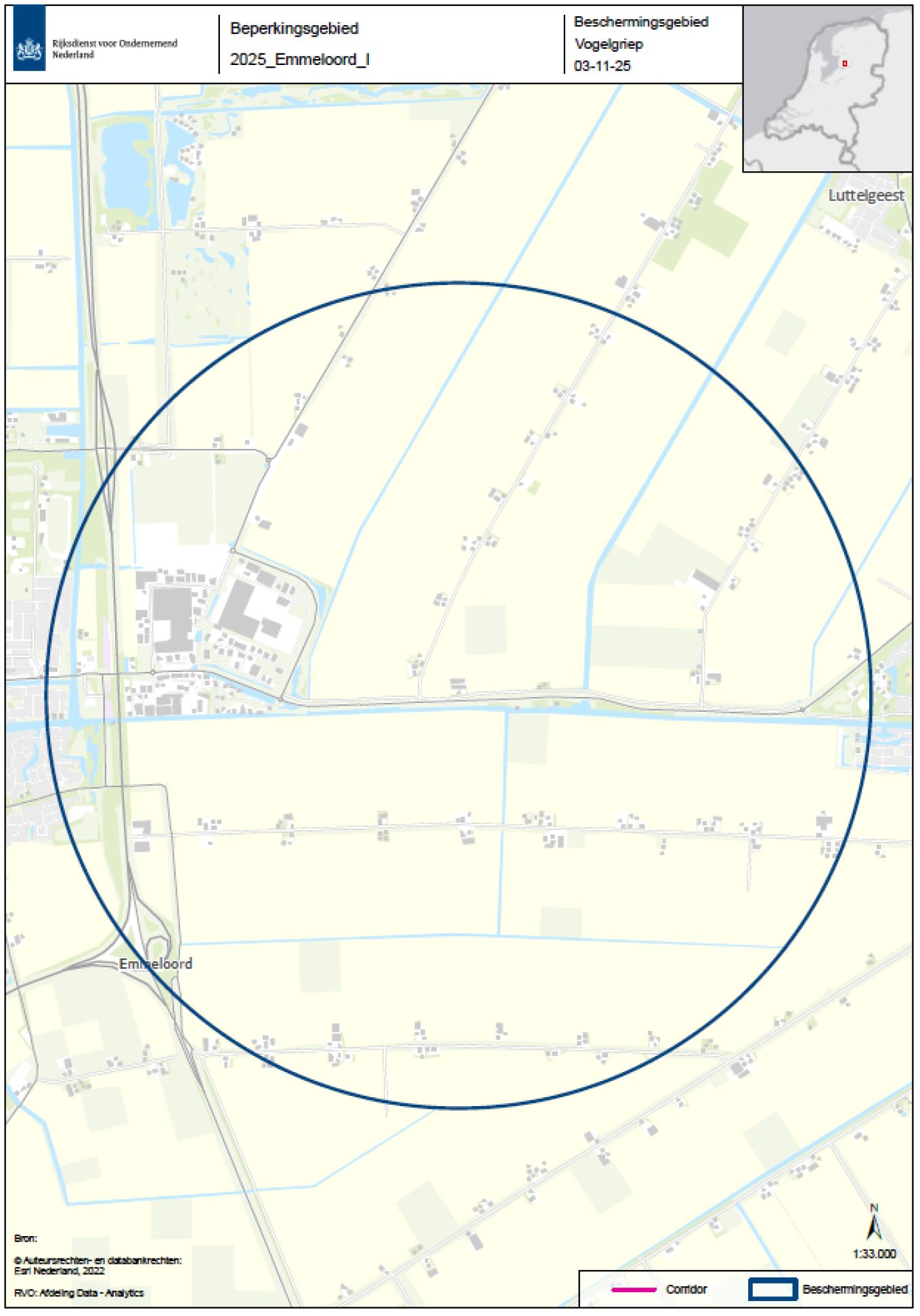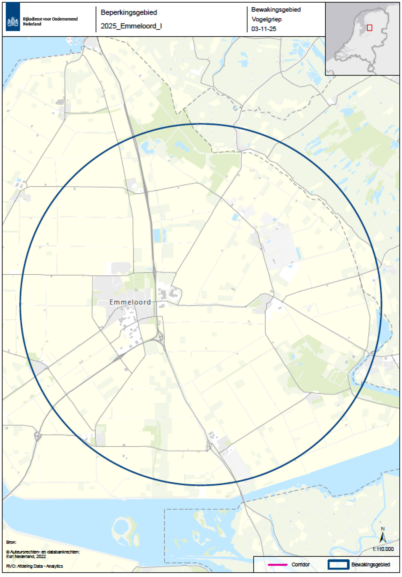 De beschermingszone en bewakingszone zijn respectievelijk het gebied met een straal van 3 en 10 kilometer rond de besmette inrichting, zoals aan de hand van een plattegrond is aangeduid in bijlagen 1 en 2. Een inzoombare, gedetailleerde kaart van die zone is beschikbaar op de website van de Rijksdienst voor Ondernemend Nederland (RVO) (Dierziekteviewer (rvo.nl)).