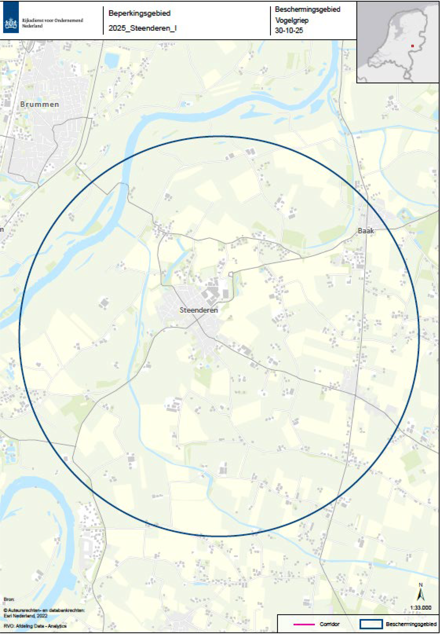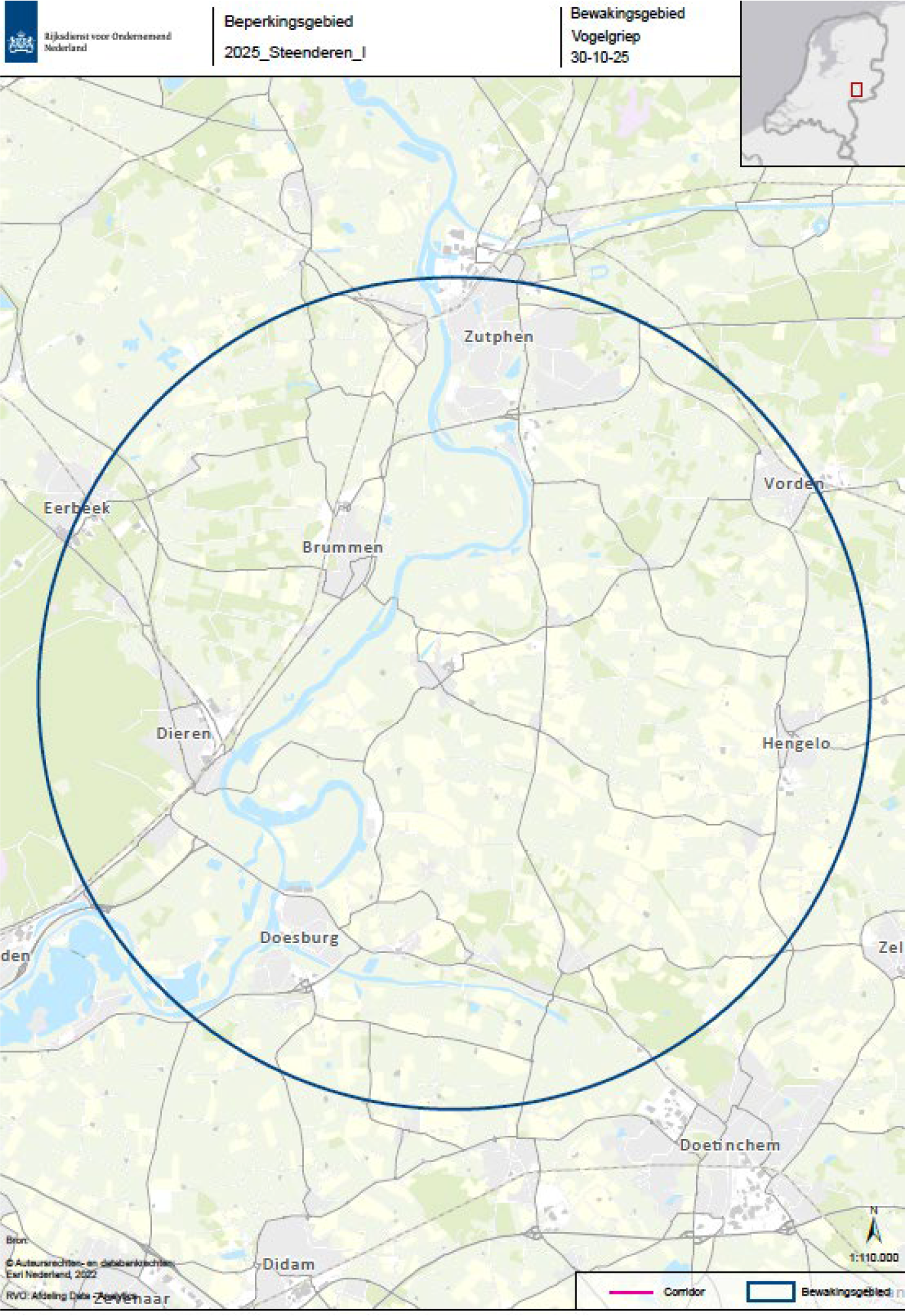 De beschermingszone en bewakingszone zijn respectievelijk het gebied met een straal van 3 en 10 kilometer rond de besmette inrichting, zoals aan de hand van een plattegrond is aangeduid in bijlagen 1 en 2. Een inzoombare, gedetailleerde kaart van die zone is beschikbaar op de website van de Rijksdienst voor Ondernemend Nederland (RVO) (Dierziekteviewer (rvo.nl)).