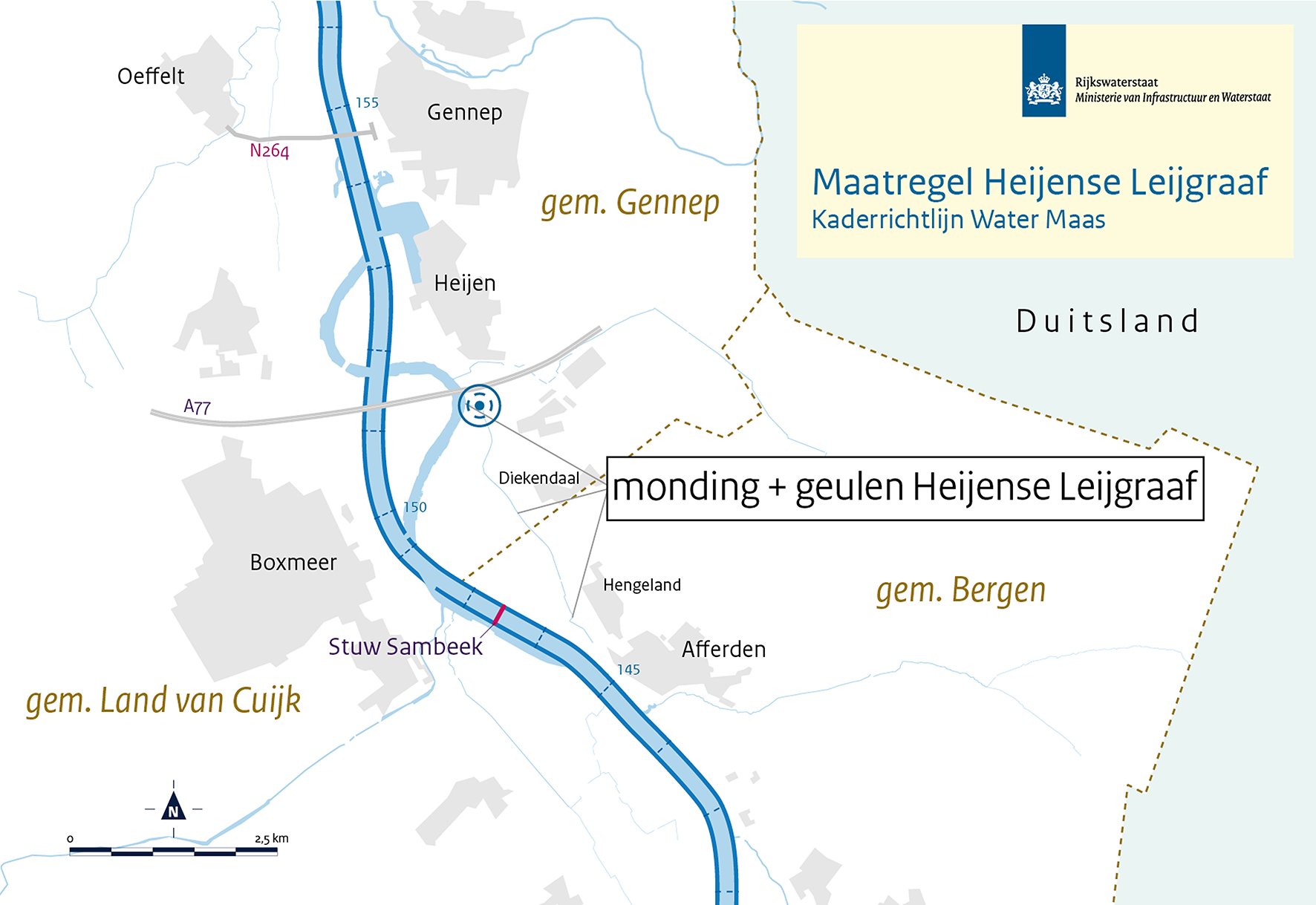 Om de biodiversiteit in en langs de noordelijke Zandmaas te verbeteren, en daarmee de ecologische waterkwaliteit, wil de Minister van Infrastructuur en Waterstaat dit gebied natuurvriendelijker inrichten. Eén van de maatregelen daarvoor is ‘Monding + geulen Heijense Leijgraaf’, deels gelegen in de gemeente Bergen en deels in de gemeente Gennep. De Heijense Leijgraaf wordt daarvoor met kleinschalige ingrepen over een lengte van ongeveer 1,8 km aantrekkelijker gemaakt voor planten en dieren om in te leven. Dat gebeurt door aan één zijde van de waterloop een natuurvriendelijke oever aan te leggen, met hier en daar dood hout in het water en ruimte voor begroeiing op de oever. Bij de uitmonding in de Oude Maasarm Heijen wordt de beekbodem verhoogd met klei en grind en doorgetrokken tot aan de cultuurhistorisch waardevolle drempel die in de monding ligt. Zo kunnen vissen voortaan de beek in zwemmen vanuit de Maasarm.