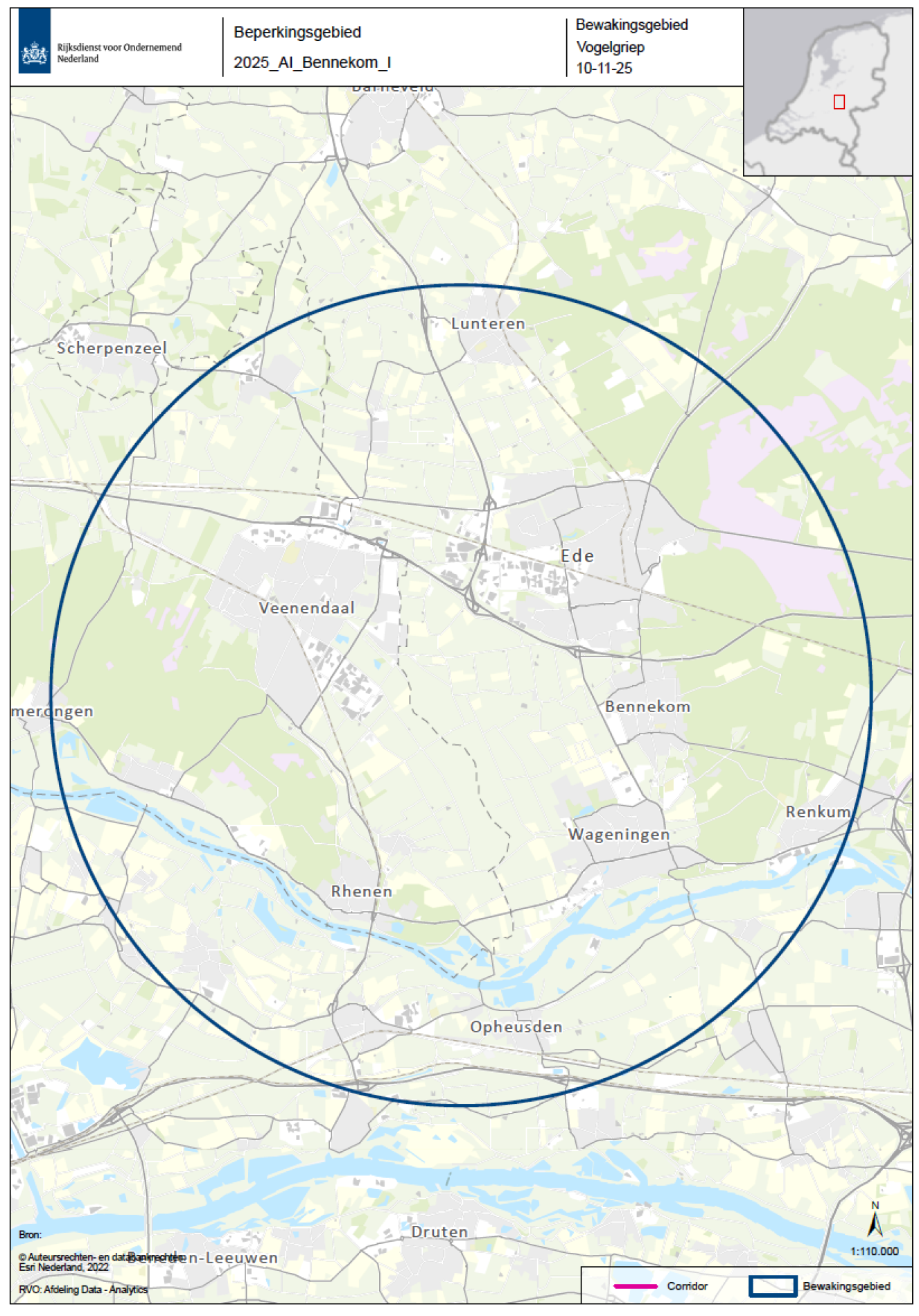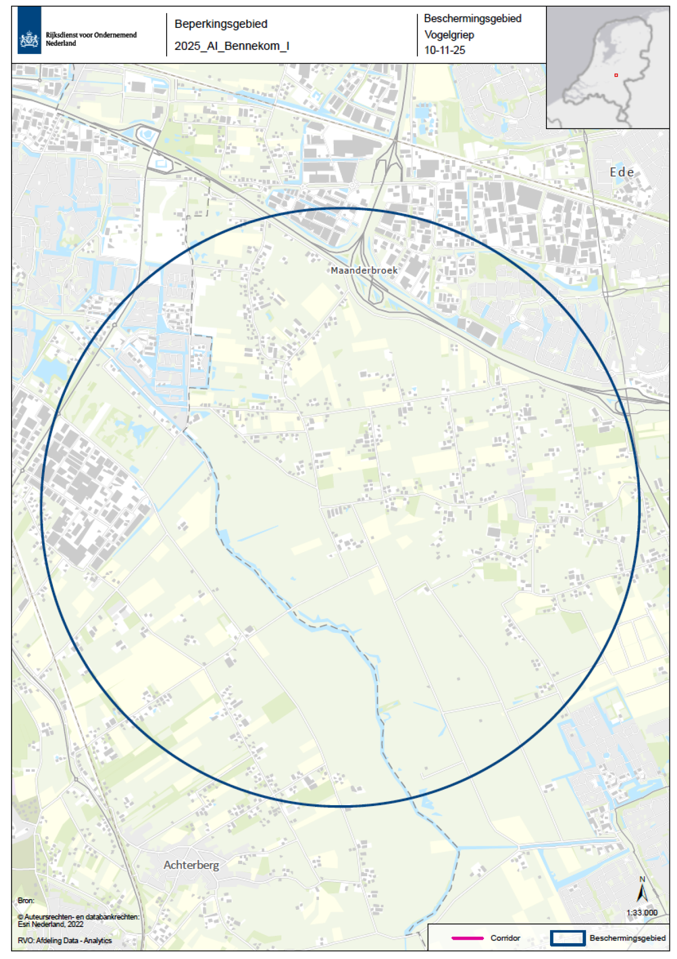 Op een inrichting in Bennekom in de provincie Gelderland is een uitbraak geconstateerd van aviaire influenza, waarschijnlijk hoogpathogene aviaire influenza (HPAI), ofwel vogelgriep. HPAI is een besmettelijke dierziekte, die tot hoge sterftecijfers kan leiden bij vogels en kan worden overgedragen op mensen (een zogenoemde zoönose). Het isoleren van de gevonden besmettingshaard en het voorkomen van verdere verspreiding van de ziekte is daarom van het grootste belang.