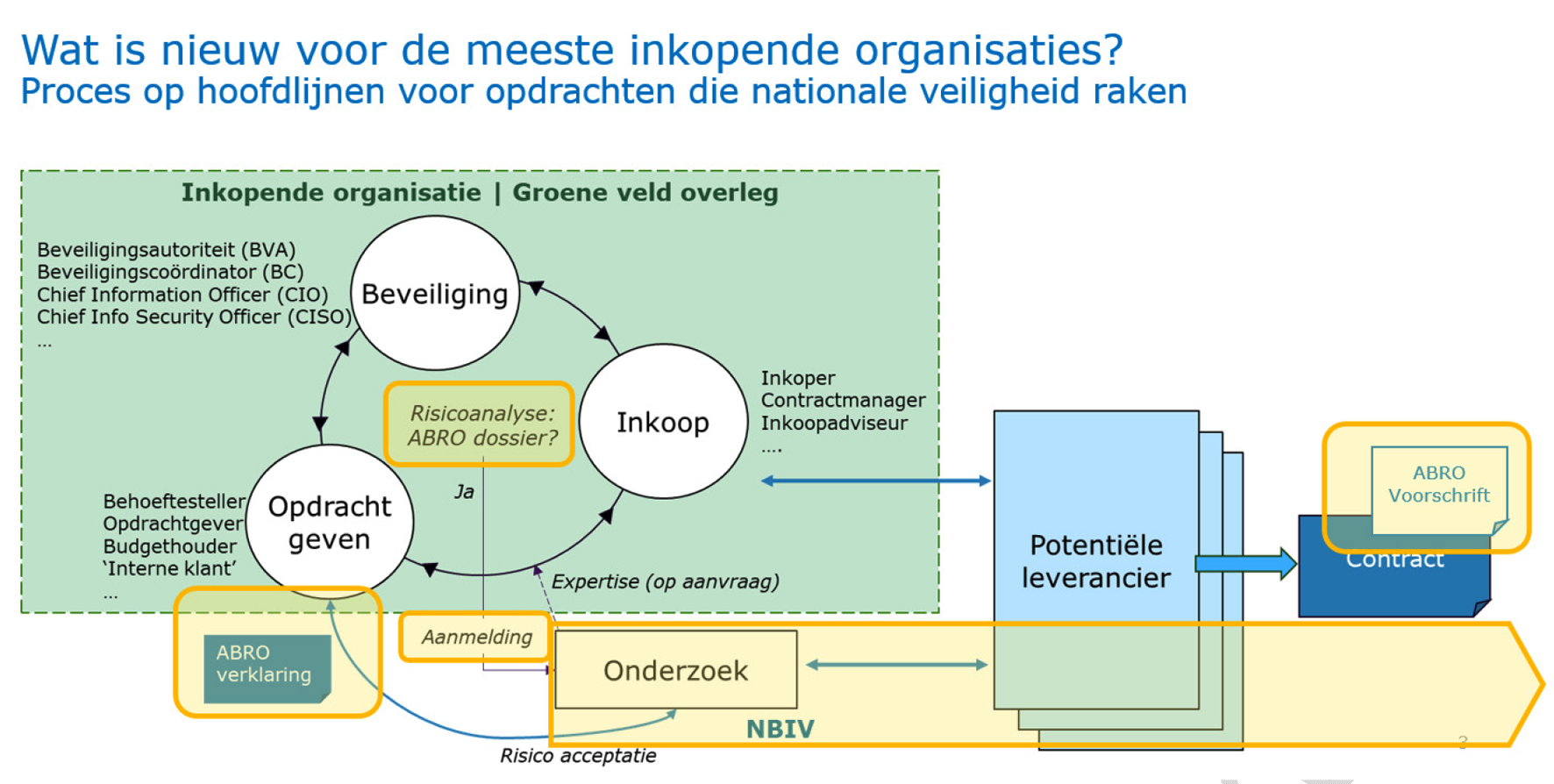 Voor elke inkoop die de nationale veiligheid kan raken, beoordeelt een departement, een daaronder ressorterend dienstonderdeel of de politie de vraag of de ABRO van toepassing zijn. De inkoop kan betrekking hebben op leveringen, diensten en werken. Dan wordt een potentiële contractpartij door NBIV onderzocht op de aspecten Bestuur en Organisatie, Personeel, en afhankelijk van de aard van de bijzondere opdracht, op de Fysieke beveiliging, Cybersecurity en Cloudsecurity. Dit onderzoek richt zich specifiek op individuele bedrijven en hun werknemers en vormt een belangrijke schakel in de beveiligingsketen. Daarnaast zijn er maatregelen aan het begin van de keten, zoals Europese regelgeving die ongewenste buitenlandse directe investeringen tegengaat. Ook is er nationale wetgeving voor het toetsen van investeringen, fusies en overnames waarbij buitenlandse partijen betrokken zijn. Een en ander vindt plaats met gebruikmaking van de inhoudelijke ABRO-beveiligingseisen, de ABRO 2026, oftewel het ABRO-voorschrift.