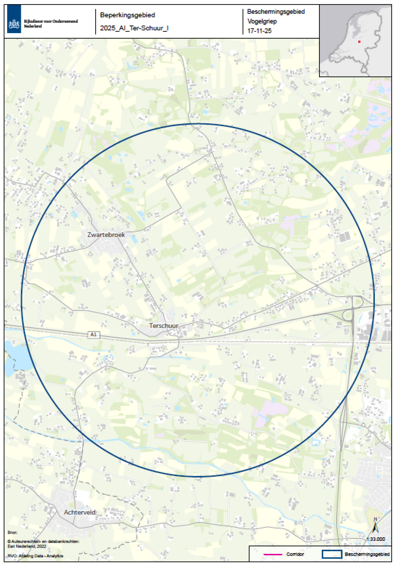 Op een inrichting in Terschuur in de provincie Gelderland is een uitbraak geconstateerd van aviaire influenza, waarschijnlijk hoogpathogene aviaire influenza (HPAI), ofwel vogelgriep. HPAI is een besmettelijke dierziekte, die tot hoge sterftecijfers kan leiden bij vogels en kan worden overgedragen op mensen (een zogenoemde zoönose). Het isoleren van de gevonden besmettingshaard en het voorkomen van verdere verspreiding van de ziekte is daarom van het grootste belang.