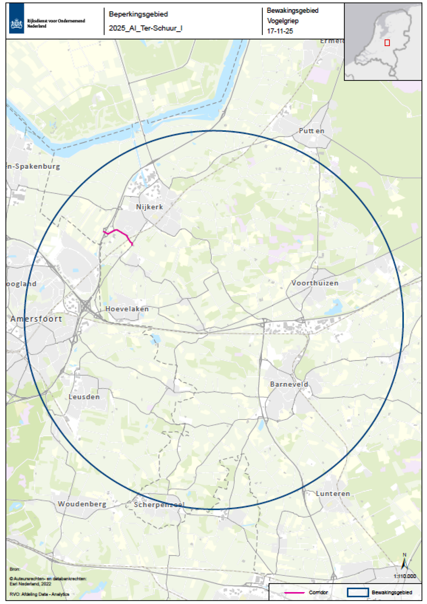 De beschermingszone en bewakingszone zijn respectievelijk het gebied met een straal van 3 en 10 kilometer rond de besmette inrichting, zoals aan de hand van een plattegrond is aangeduid in bijlagen 1 en 2. Een inzoombare, gedetailleerde kaart van die zone is beschikbaar op de website van de Rijksdienst voor Ondernemend Nederland (RVO) (GeoWeb).
