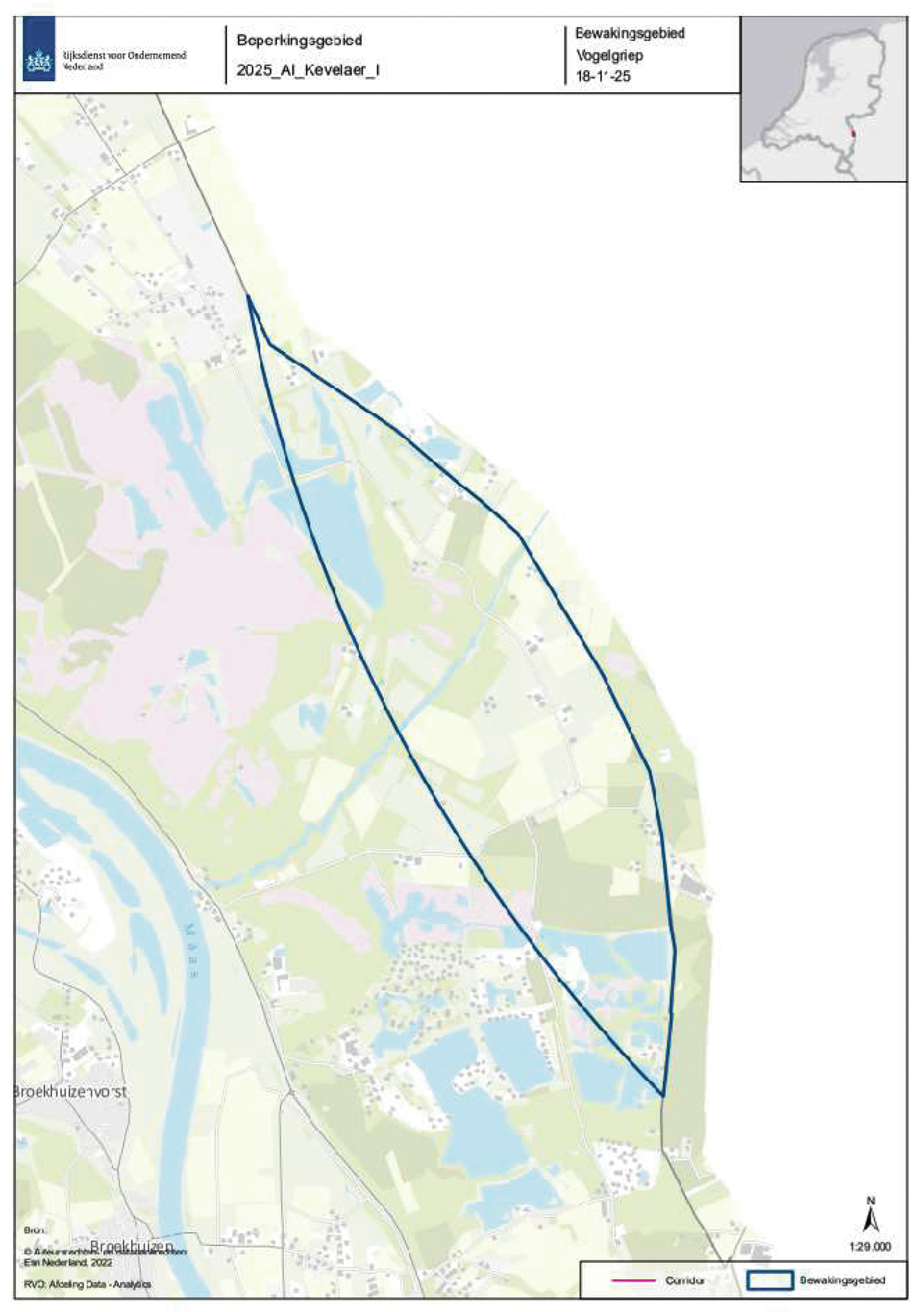 Eén van die maatregelen is het instellen van een beperkingszone die bestaat uit een bewakingszone rond de besmette inrichting in Kevelaer. De bewakingszone ligt voor een deel op Nederlands grondgebied. Voor dat deel is het aan de Minister van Landbouw, Visserij, Voedselzekerheid en Natuur om op grond van de Wet dieren de maatregelen te treffen.