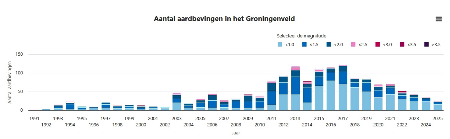 dashboard valt duidelijk de afnemende lijn in het aantal aardbevingen waar te nemen.4