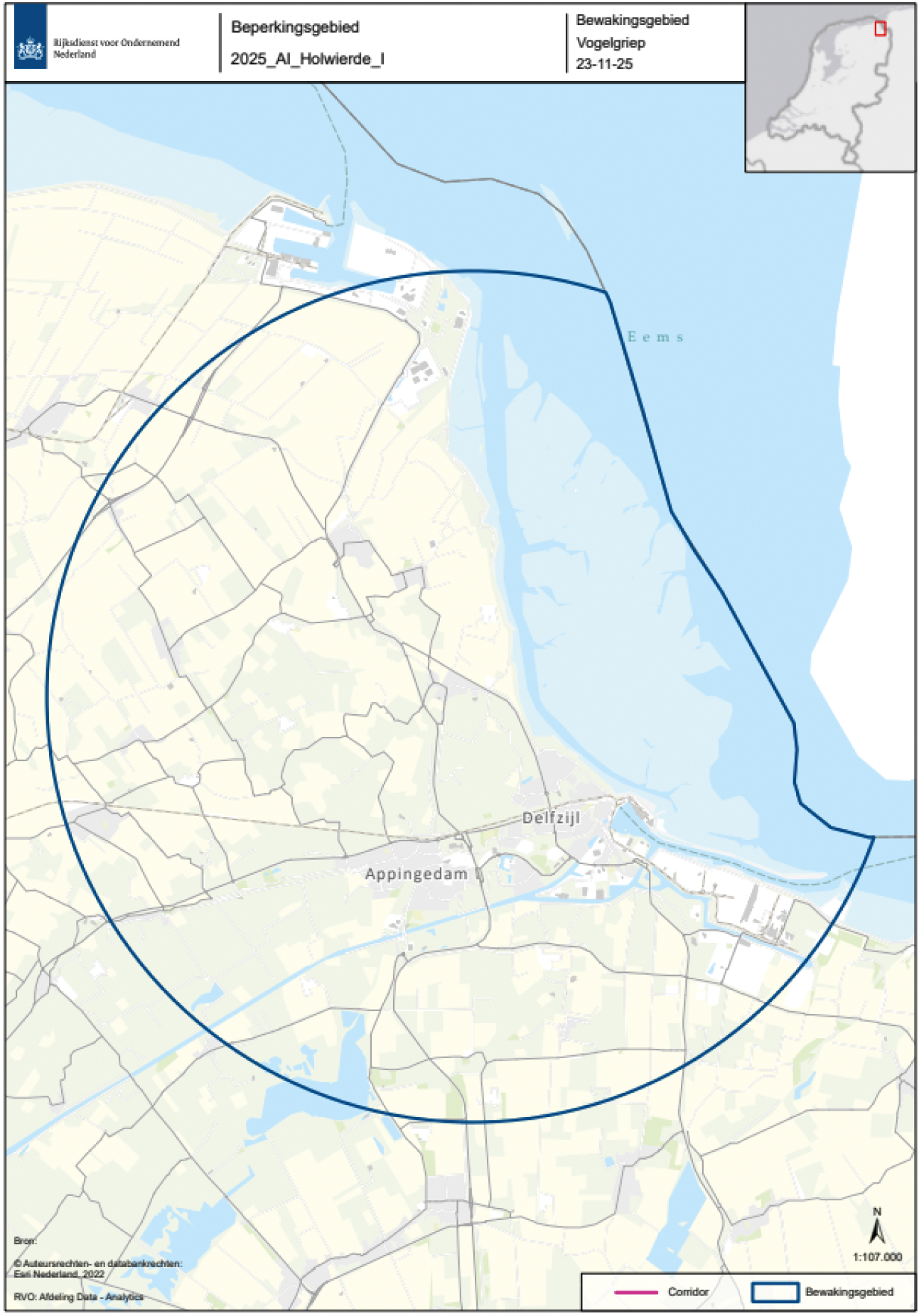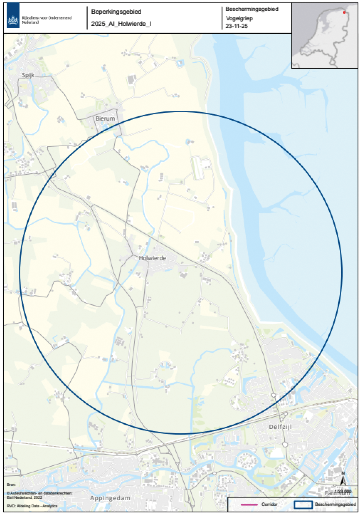 De beschermingszone en bewakingszone zijn respectievelijk het gebied met een straal van 3 en 10 kilometer rond de besmette inrichting, zoals aan de hand van een plattegrond is aangeduid in bijlagen 1 en 2. Een inzoombare, gedetailleerde kaart van die zone is beschikbaar op de website van de Rijksdienst voor Ondernemend Nederland (RVO) (GeoWeb).