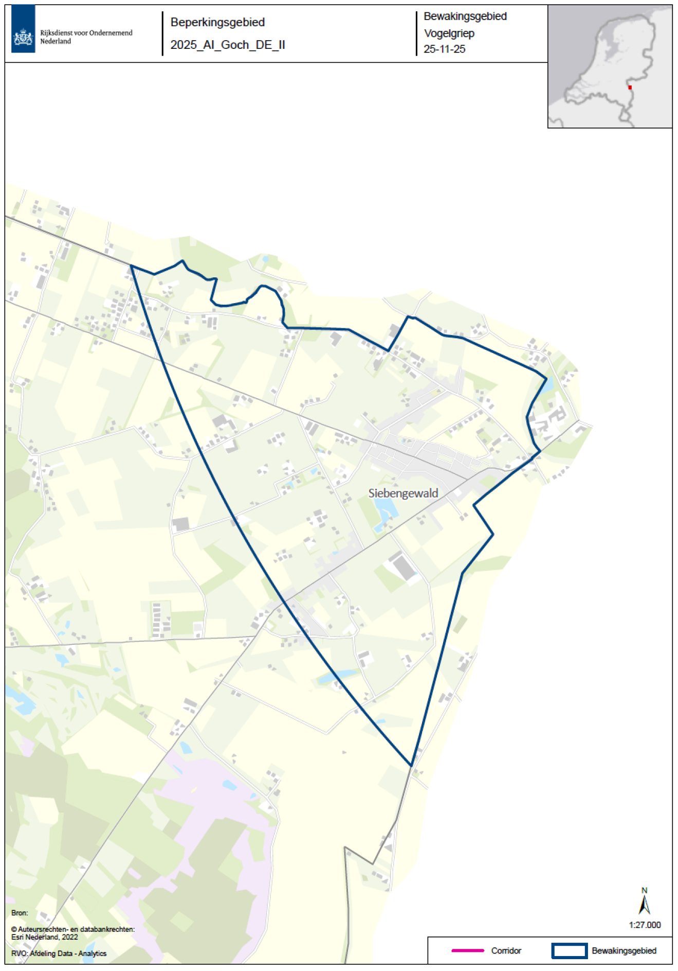 Eén van die maatregelen is het instellen van een beperkingszone die bestaat uit een bewakingszone rond de besmette inrichting in Goch. De bewakingszone ligt voor een deel op Nederlands grondgebied. Voor dat deel is het aan de Minister van Landbouw, Visserij, Voedselzekerheid en Natuur om op grond van de Wet dieren de maatregelen te treffen.
