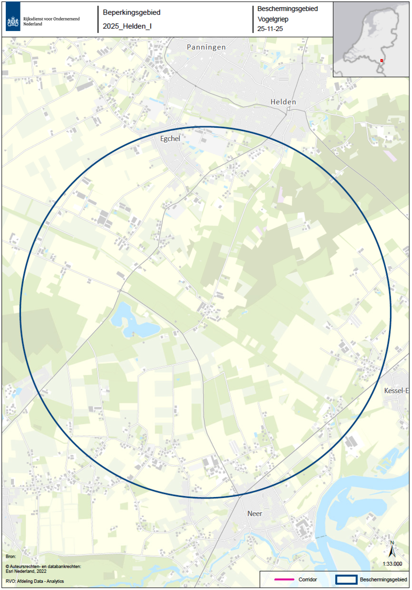 Op een inrichting in Helden, gemeente Peel en Maas, in de provincie Limburg is een uitbraak geconstateerd van aviaire influenza, waarschijnlijk hoogpathogene aviaire influenza (HPAI), ofwel vogelgriep. HPAI is een besmettelijke dierziekte, die tot hoge sterftecijfers kan leiden bij vogels en kan worden overgedragen op mensen (een zogenoemde zoönose). Het isoleren van de gevonden besmettingshaard en het voorkomen van verdere verspreiding van de ziekte is daarom van het grootste belang.