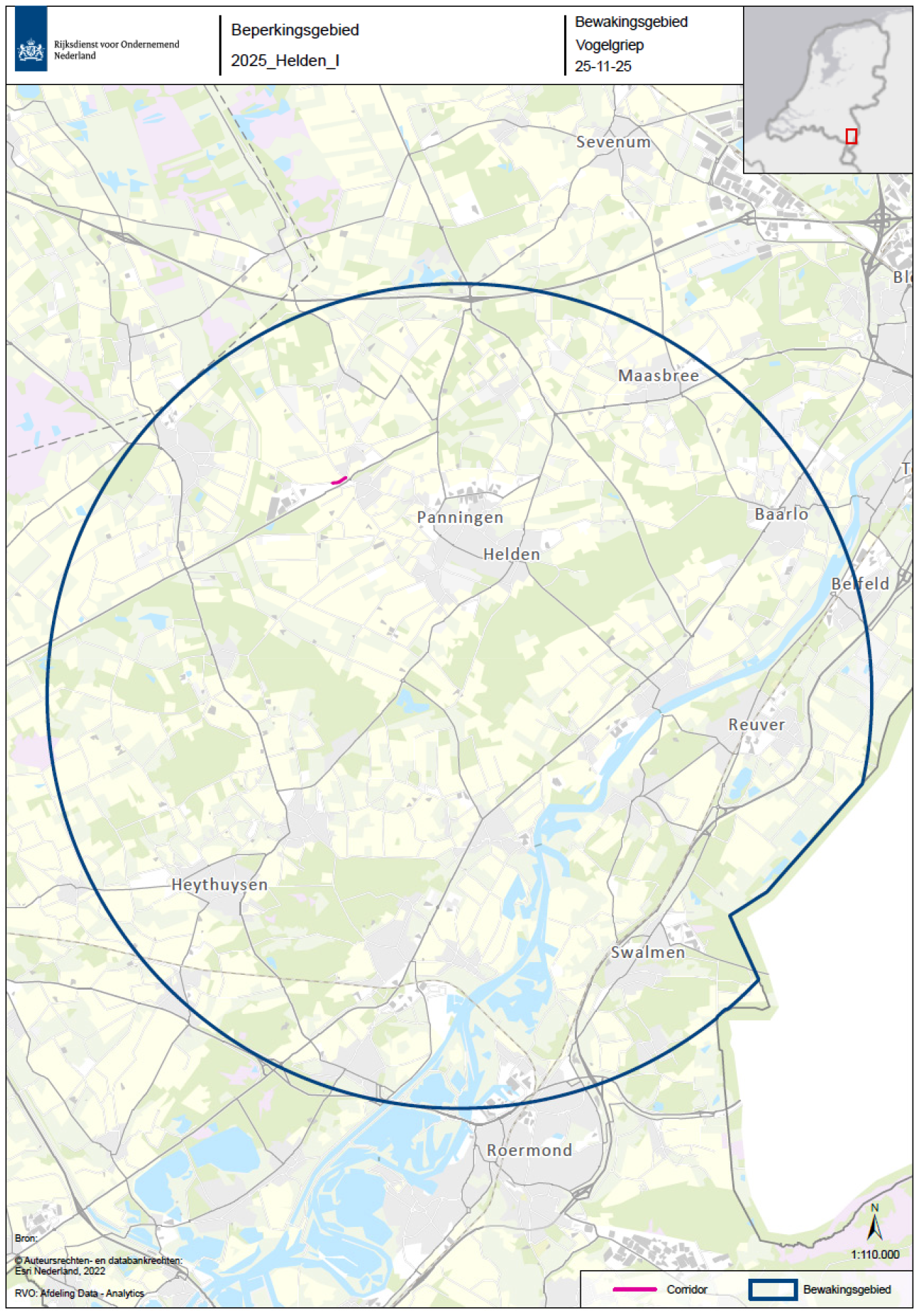 Eén van die maatregelen is het instellen van een beperkingszone die bestaat uit een beschermings- en bewakingszone rond de besmette inrichting in Helden. De bewakingszone ligt grotendeels op Nederlands grondgebied. Voor dat deel is het aan de Minister van Landbouw, Visserij, Voedselzekerheid en Natuur om op grond van de Wet dieren maatregelen te treffen.
