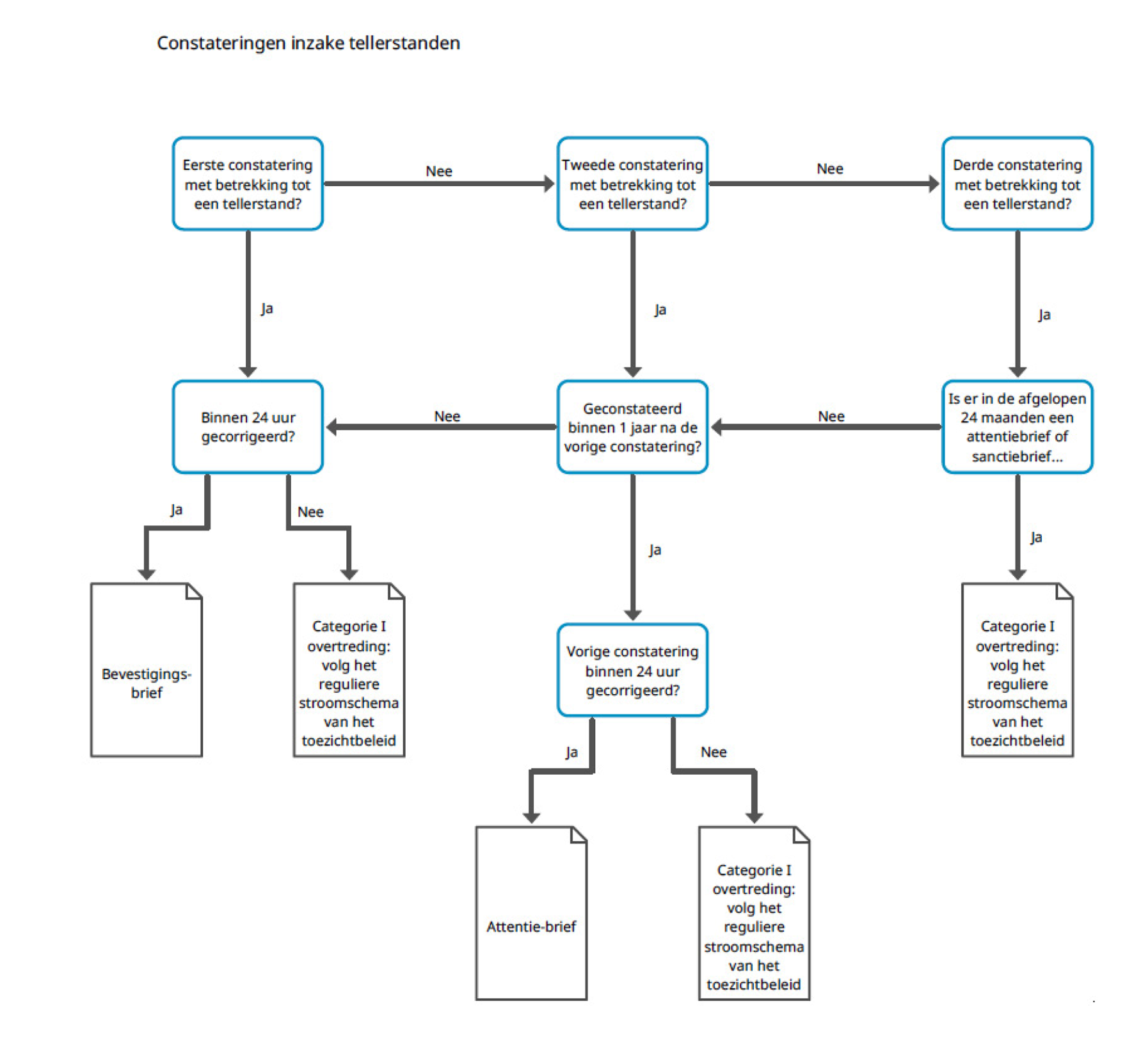 4. Voor overtredingen van het opgeven van tellerstanden bij de erkenning tenaamstellen bedrijfsvoorraad of importeursvoorraad, de erkenning export, de erkenning bedrijfsvoorraad en de erkenning inschrijven met onderzoek geldt een apart stroomschema. Dit stroomschema staat onderaan dit hoofdstuk.