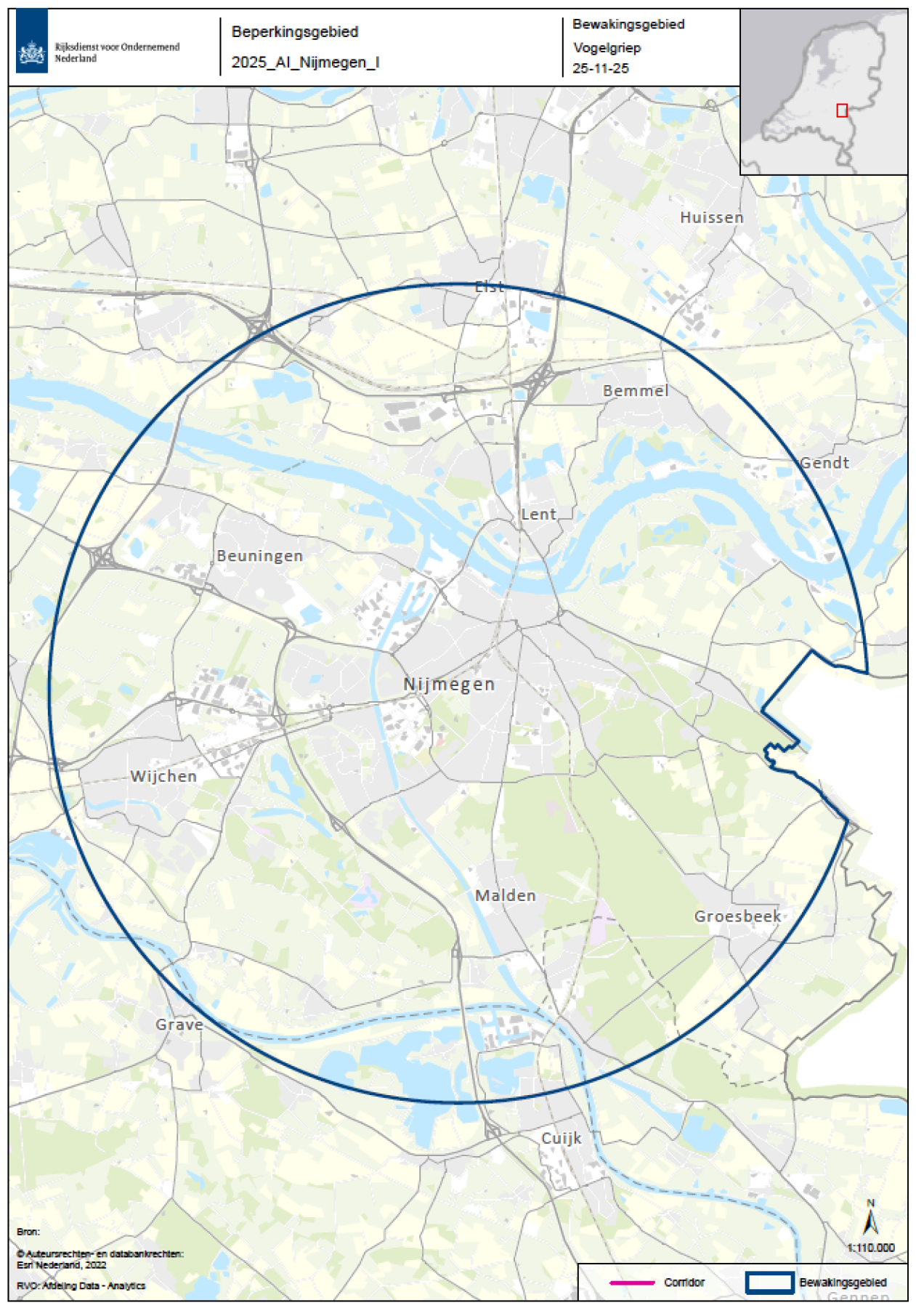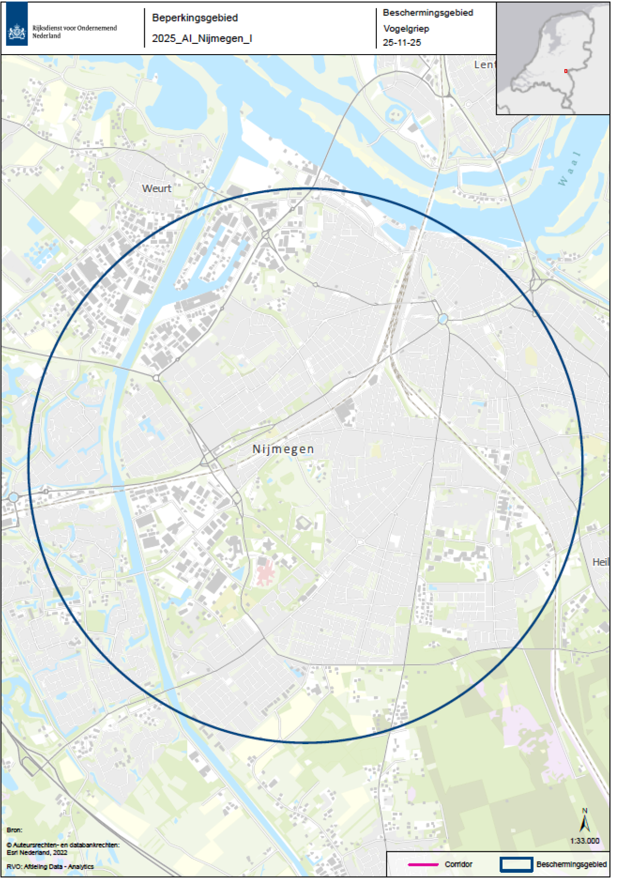 Op een inrichting in Nijmegen in de provincie Gelderland is een uitbraak geconstateerd van aviaire influenza, waarschijnlijk hoogpathogene aviaire influenza (HPAI), ofwel vogelgriep. HPAI is een besmettelijke dierziekte, die tot hoge sterftecijfers kan leiden bij vogels en kan worden overgedragen op mensen (een zogenoemde zoönose). Het isoleren van de gevonden besmettingshaard en het voorkomen van verdere verspreiding van de ziekte is daarom van het grootste belang.