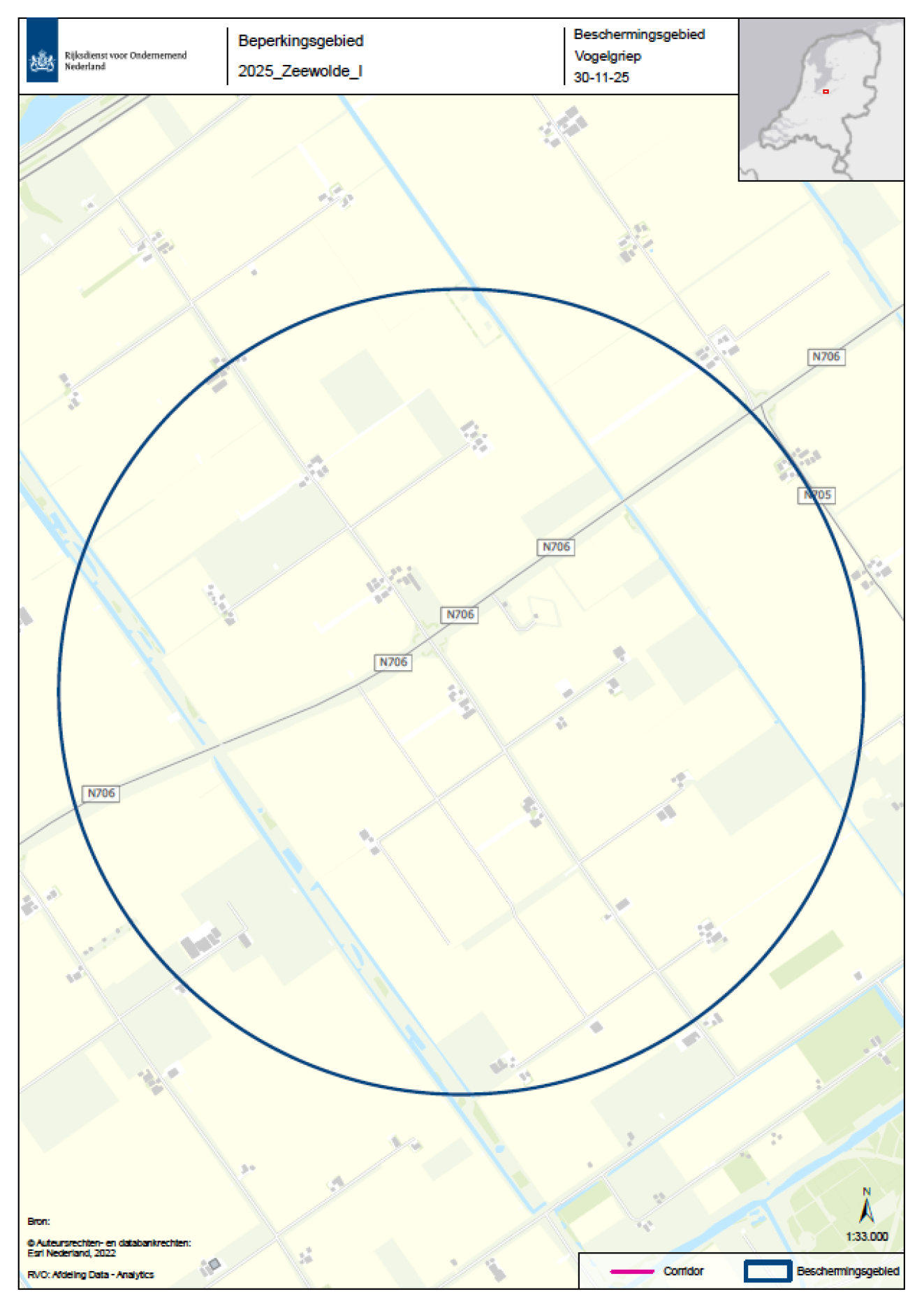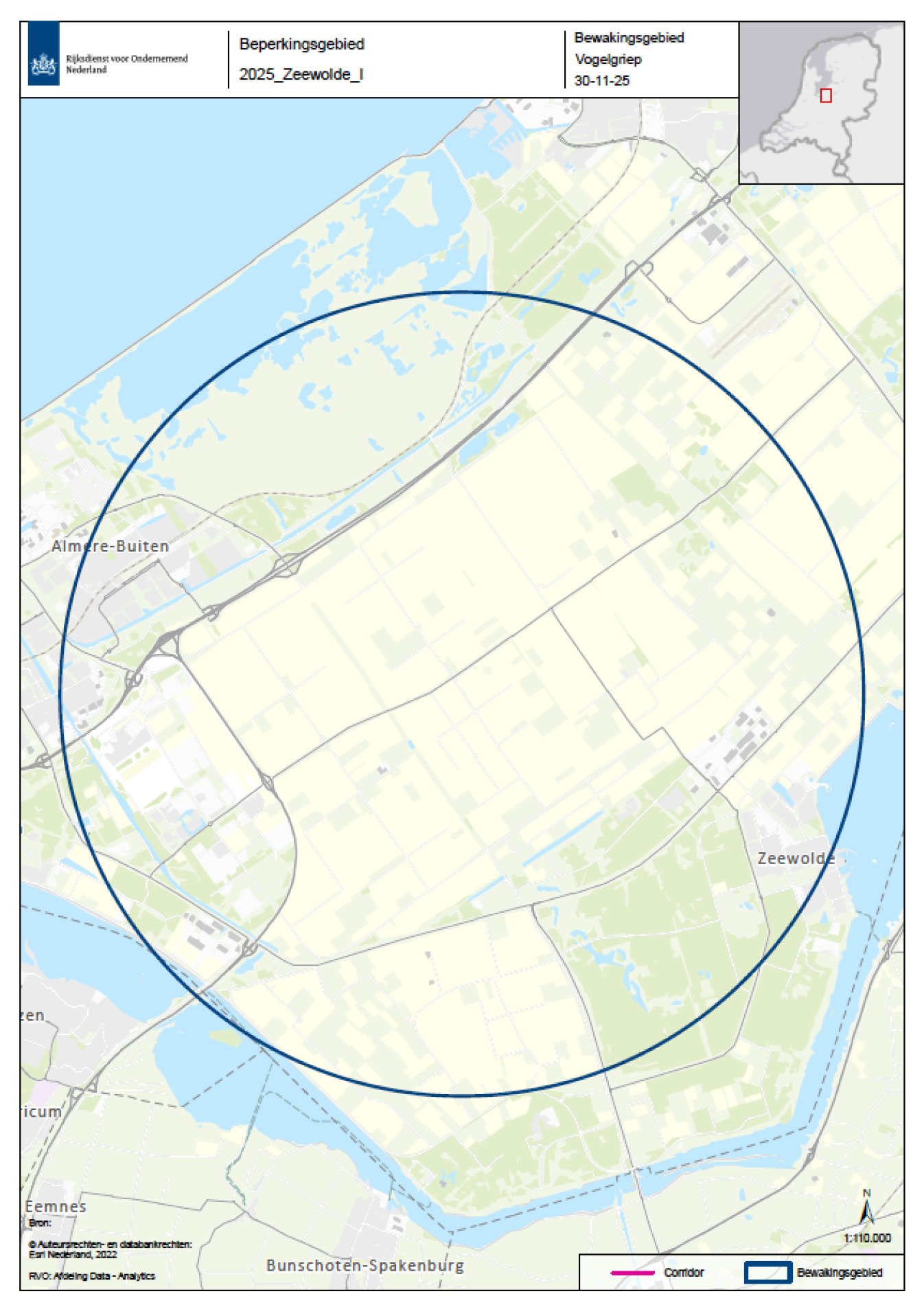 De beschermingszone en bewakingszone zijn respectievelijk het gebied met een straal van 3 en 10 kilometer rond de besmette inrichting, zoals aan de hand van een plattegrond is aangeduid in bijlagen 1 en 2. Een inzoombare, gedetailleerde kaart van die zone is beschikbaar op de website van de Rijksdienst voor Ondernemend Nederland (RVO) (GeoWeb).