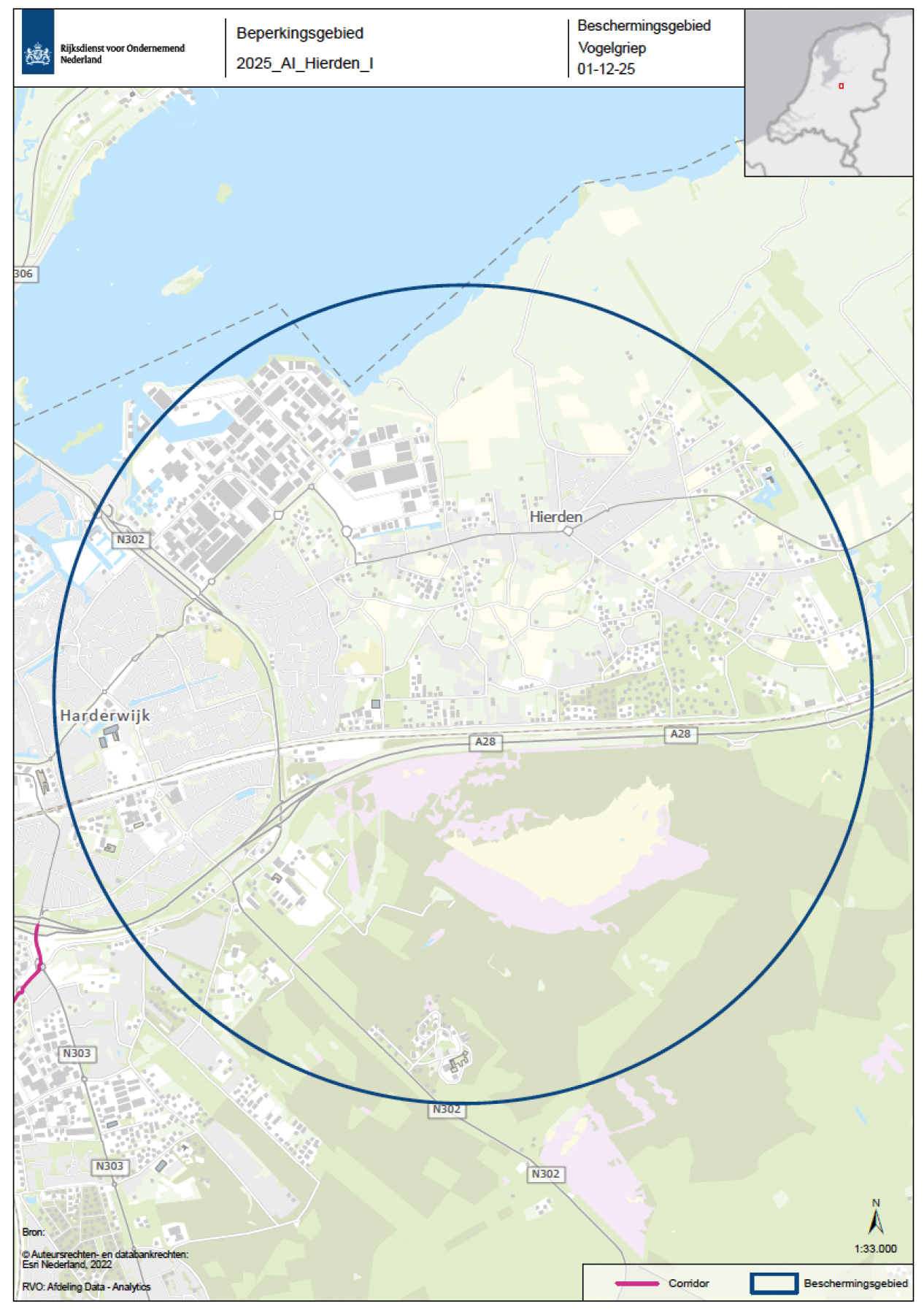 Op een inrichting in Hierden in de provincie Gelderland is een uitbraak geconstateerd van aviaire influenza, waarschijnlijk hoogpathogene aviaire influenza (HPAI), ofwel vogelgriep. HPAI is een besmettelijke dierziekte, die tot hoge sterftecijfers kan leiden bij vogels en kan worden overgedragen op mensen (een zogenoemde zoönose). Het isoleren van de gevonden besmettingshaard en het voorkomen van verdere verspreiding van de ziekte is daarom van het grootste belang.
