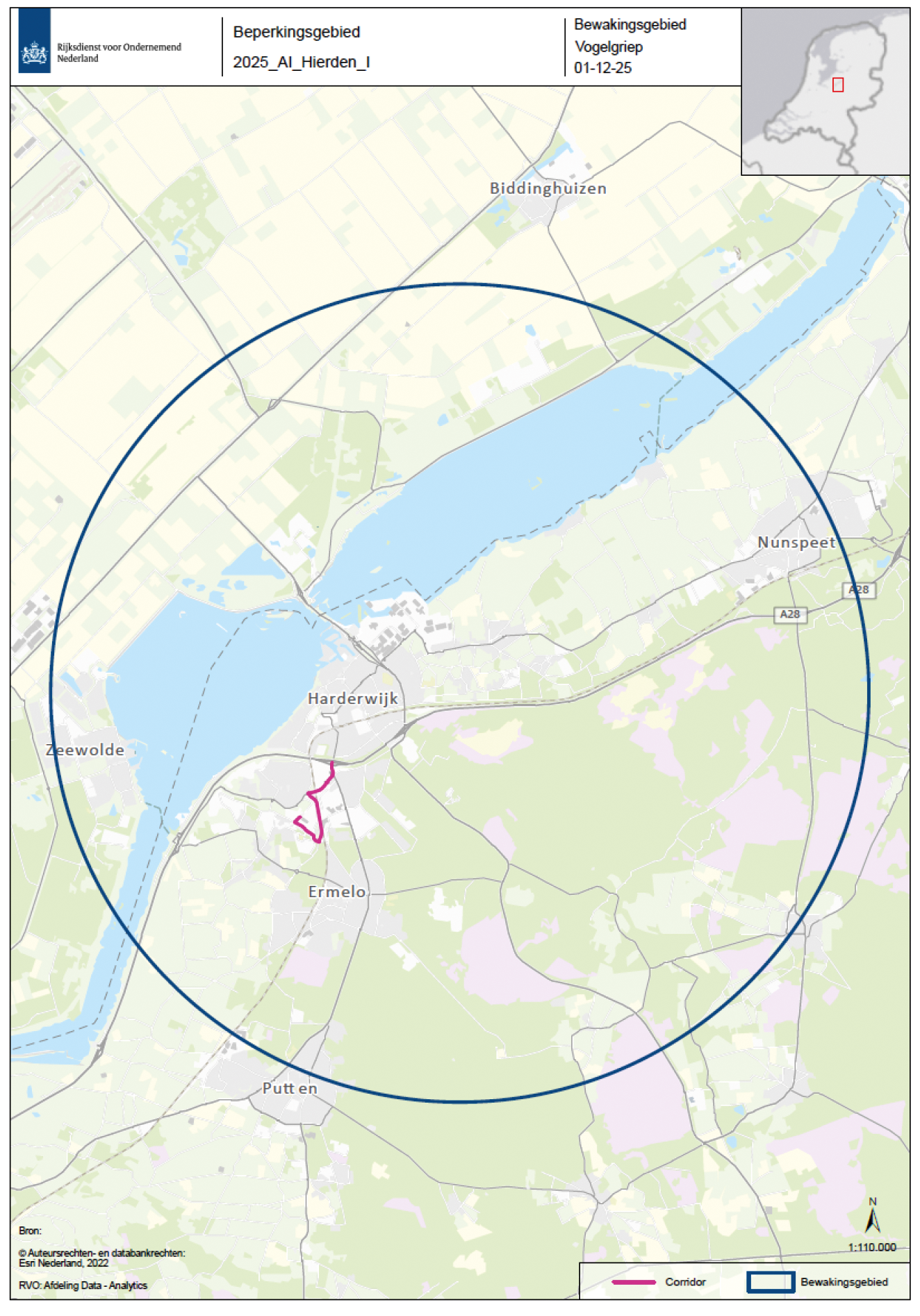 De beschermingszone en bewakingszone zijn respectievelijk het gebied met een straal van 3 en 10 kilometer rond de besmette inrichting, zoals aan de hand van een plattegrond is aangeduid in bijlage 1. Een inzoombare, gedetailleerde kaart van die zone is beschikbaar op de website van de Rijksdienst voor Ondernemend Nederland (RVO) (GeoWeb).