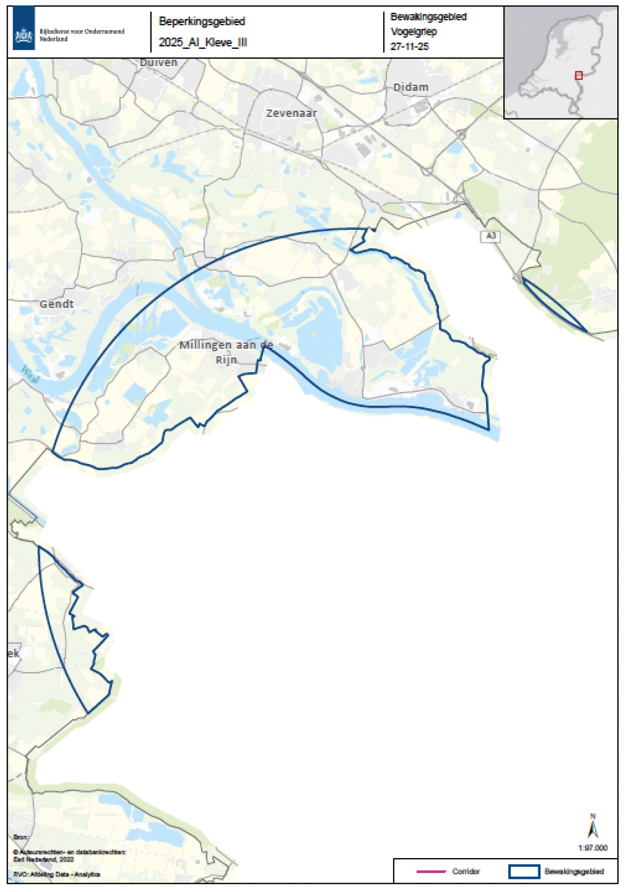 De bewakingszone is het gebied met een straal van 10 kilometer rond de besmette inrichting, voor zover gelegen in Nederland. Deze is aan de hand van een plattegrond aangeduid in de bijlage. Een inzoombare, gedetailleerde kaart van die zone is beschikbaar op de website van de Rijksdienst voor Ondernemend Nederland (RVO) (GeoWeb).