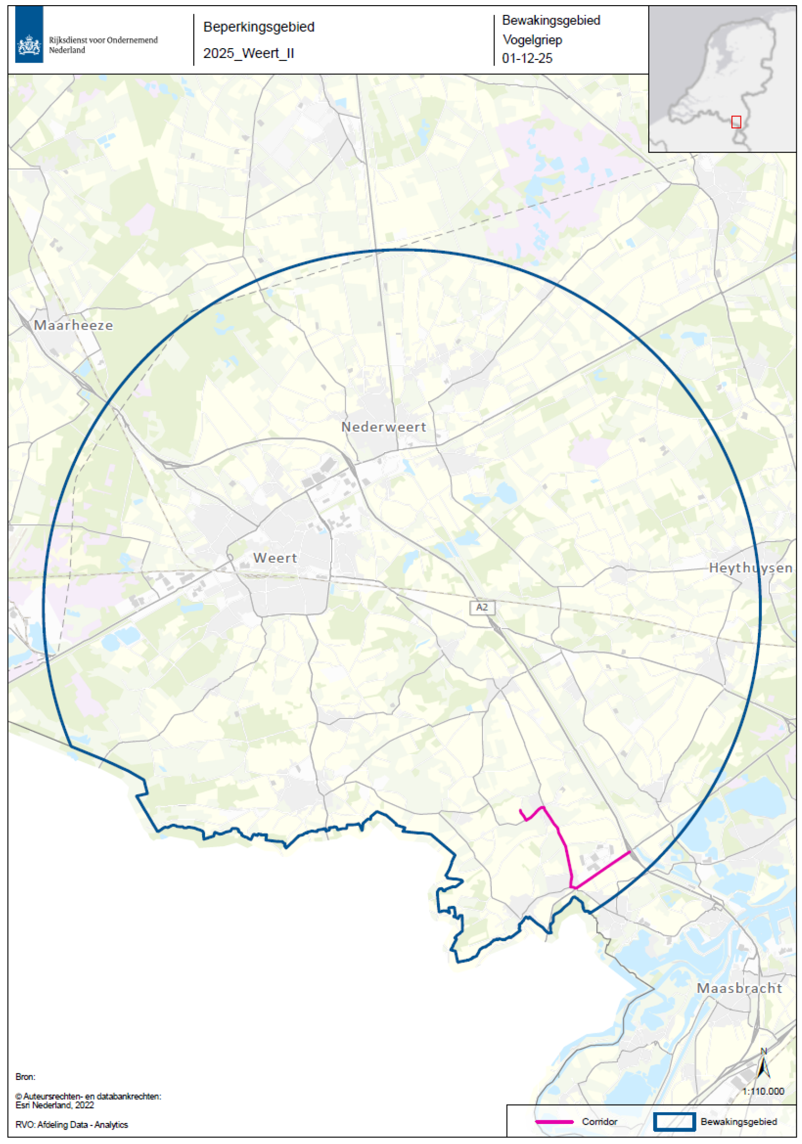 De beschermingszone en bewakingszone zijn respectievelijk het gebied met een straal van 3 en 10 kilometer rond de besmette inrichting, zoals aan de hand van een plattegrond is aangeduid in bijlage 1. Een inzoombare, gedetailleerde kaart van die zone is beschikbaar op de website van de Rijksdienst voor Ondernemend Nederland (RVO) (GeoWeb).