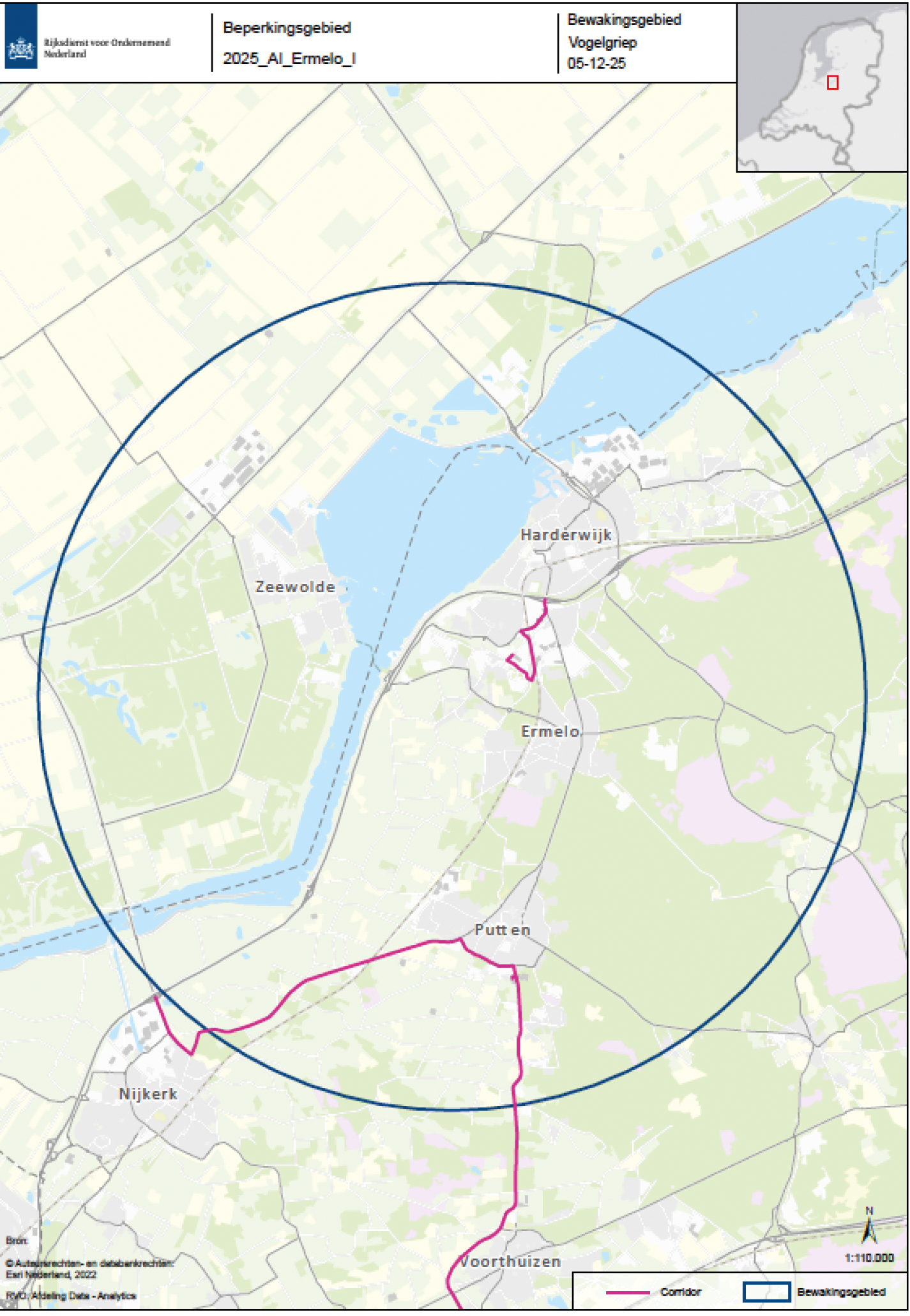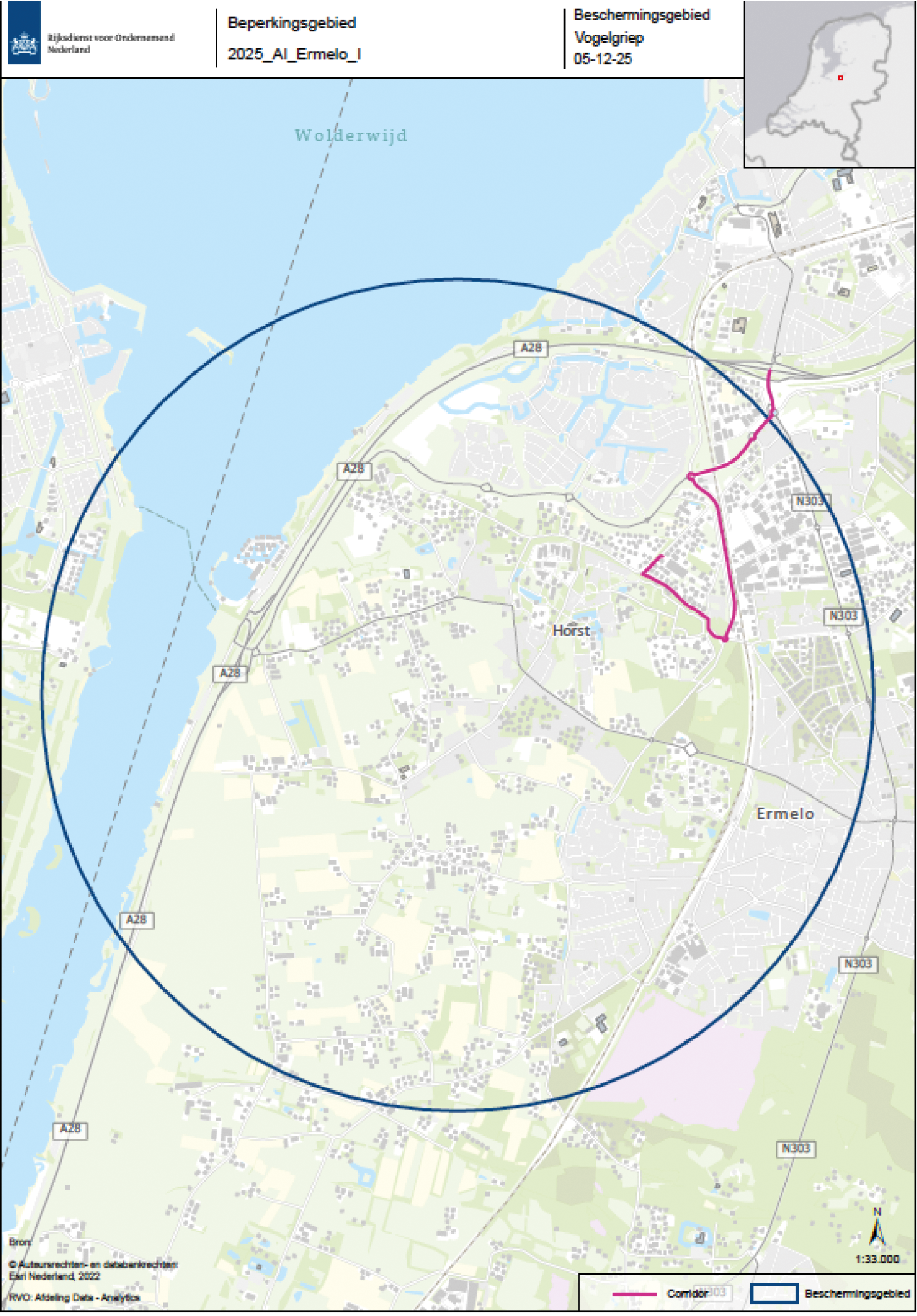 Op een inrichting in Ermelo in de provincie Gelderland is een uitbraak geconstateerd van aviaire influenza, waarschijnlijk hoogpathogene aviaire influenza (HPAI), ofwel vogelgriep. HPAI is een besmettelijke dierziekte, die tot hoge sterftecijfers kan leiden bij vogels en kan worden overgedragen op mensen (een zogenoemde zoönose). Het isoleren van de gevonden besmettingshaard en het voorkomen van verdere verspreiding van de ziekte is daarom van het grootste belang.